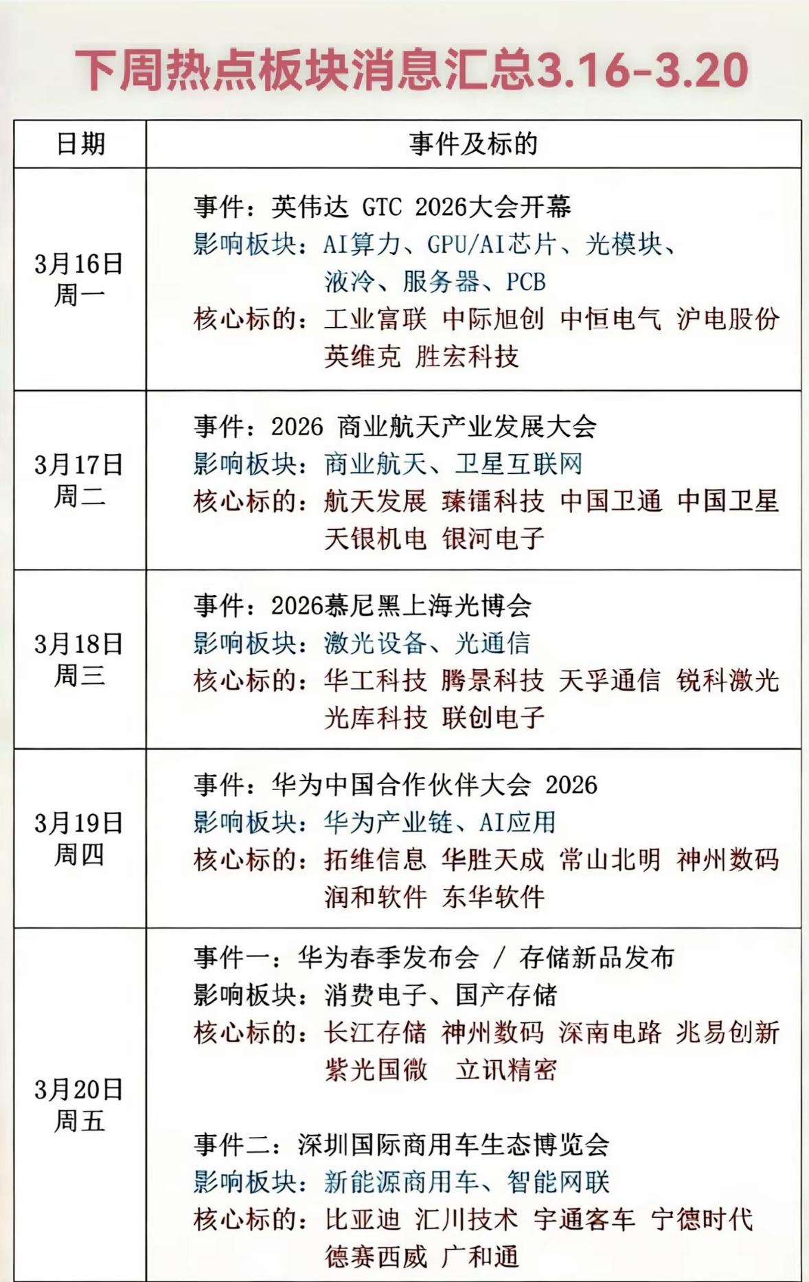 📅3.16-3.20,关注AI、航天、光通信等板块! 下周(3.16 - 3.20)的热点板块有看头!AI 板块,现在人工智能发展得那叫一个迅猛,像智能语音助手、图像识别技术,应用场景越来越广,相关企业的业绩说不定会跟着起飞。航天板块也不容小觑,国家对航天事业投入不断加大,卫星发射、深空探测等项目持续推进,背后的产业链公司有很大的想象空间。光通信板块,随着 5G 网络建设和数据中心的发展,对高速、大容量的光通信需求大增,相关企业有望迎来红利。这几个板块下周值得重点关注,说不定能挖到宝呢!