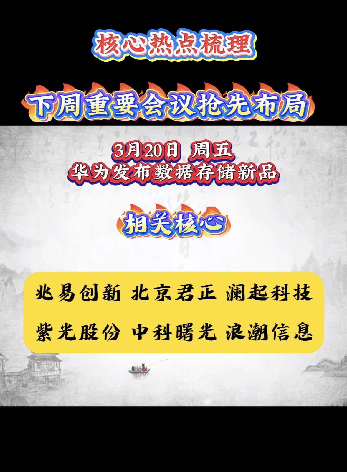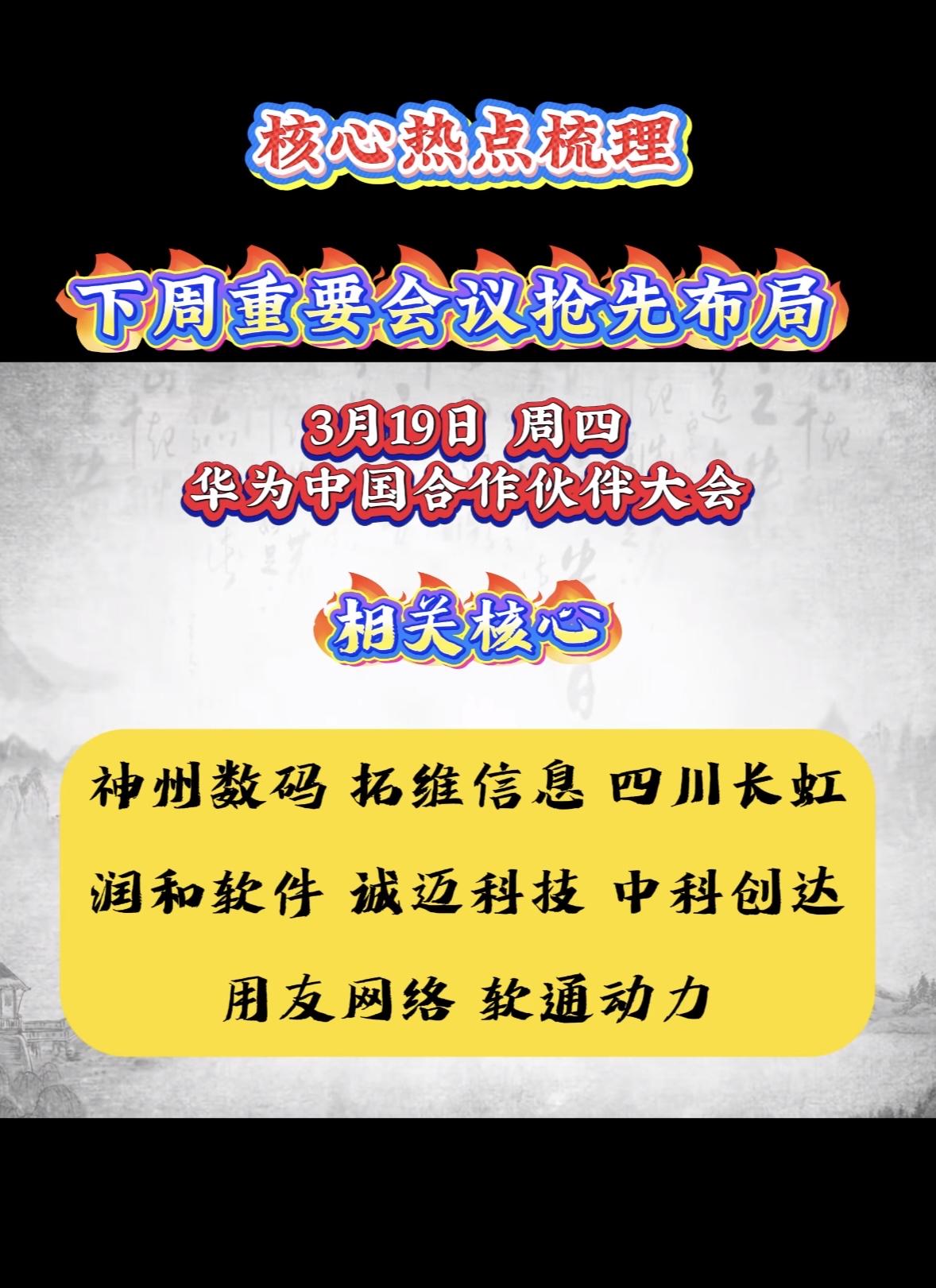 3月16日下周的重要会议可太值得关注了。 尤其是跟华为合作大会有关的核心内容。华为在科技领域那可是大佬级别的存在,每次有相关大会都会掀起不小的波澜。 抢先布局很有必要,说不定这里面就藏着未来的风口。比如之前华为的一些技术合作项目,带动了一批相关企业股价上涨。这次合作大会核心内容,可能涉及5G、人工智能等前沿领域。要是能提前抓住机会,说不定能在市场里大赚一笔。大家可得密切关注,说不定这就是改变命运的一次机遇。