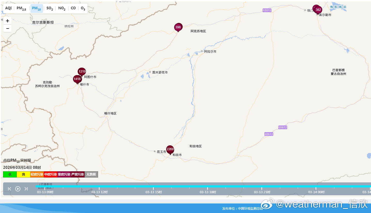 【沙尘和霾】今晨新疆塔里木盆地的沙尘持续,和田、喀什等站点继续爆表,但PM10浓