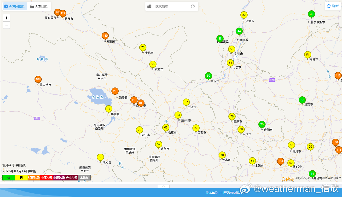 【沙尘和霾】今晨新疆塔里木盆地的沙尘持续,和田、喀什等站点继续爆表,但PM10浓度比之前有所下降。今晨青海甘肃宁夏陕西一带,因为降水的清除作用,沙尘基本没了,空气质量普遍好转。而在华北南部和黄淮等地,依然还有霾,山东德州、聊城、河南安阳、洛阳出现重污染。