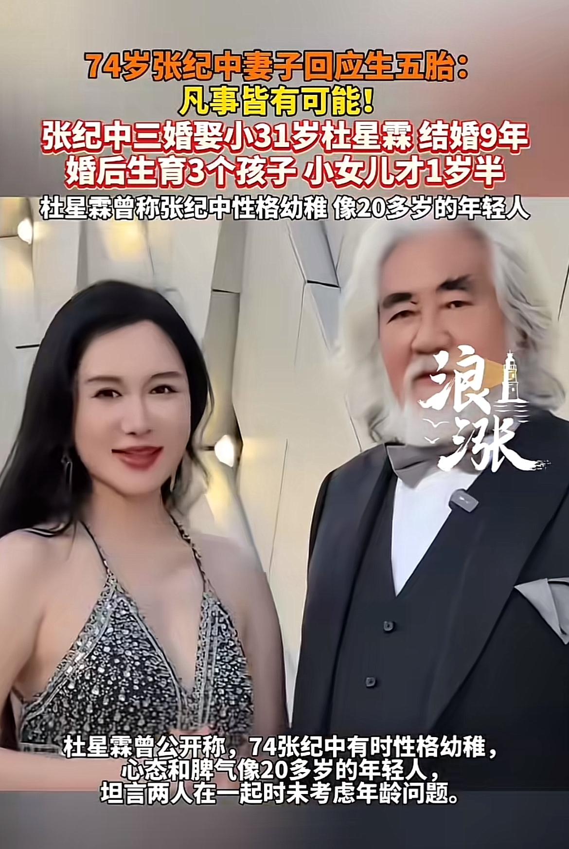 74岁张纪中妻子杜星霖在直播回应生五胎,称“凡事皆有可能”,还反问“不喜欢能生那么多吗”,这回应一出来就炸锅了。 张纪中作为知名导演,翻拍过好多金庸经典剧。他和现任妻子杜星霖年龄差不小,不过人家家庭阵容可庞大,已有4个孩子。大儿子马丁是杜星霖婚前试管所生,张纪中视如己出。2017年领证后,杜星霖开启高频生育模式,2019到2024年接连生子。 杜星霖说张纪中虽年纪大,但精力充沛,还能冲浪带娃。不过直播里她也吐槽张纪中邋遢,不干家务。这生五胎到底成不成,真是让人拭目以待。