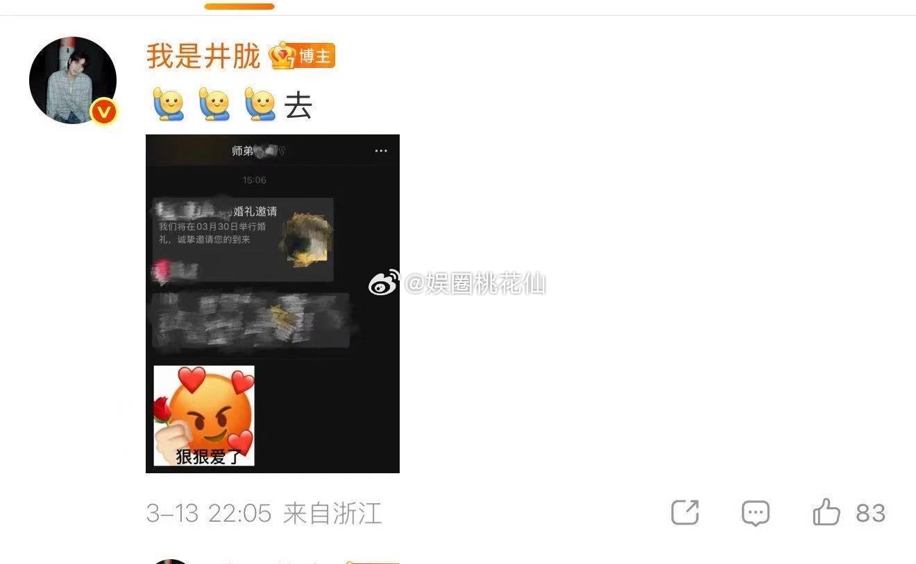 井胧上一秒误闯婚礼下一秒受邀婚礼 谁看了不说一句巧!井胧在节目里误闯婚礼还没缓过神,转头就被师弟的喜帖砸中,从“手忙脚乱的闯入者”到“被期待的嘉宾”,这剧情比综艺还抓马~ 下班就接喜事儿,这次总算能稳稳当回宾客,再也不用慌慌张张怕搞错,网友建议他搞婚礼跟拍,毕竟拍照氛围这块他是真拿手!