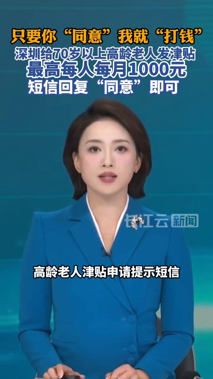 深圳给70岁以上高龄老人发津贴,最高每人每月1000元,短信回复"同意"即可。 深圳给老人发钱了。近日,《深圳市高龄老人津贴发放管理办法》正式施行。根据办法,持有深圳智慧养老颐联卡的户籍老年人,在年满70周岁的前两个月,深圳市民政部门就会通过市政务短信平台向他们推送高龄老人津贴申请提示短信。 收到短信后,老人只需回复"同意"二字,即视为提出申请。相应津贴每月20日之前会打到老人的卡上。随着老人年龄增长,系统将自动调整发放津贴的金额。70至79周岁老人,每人每月200元;80至89周岁,每人每月300元;90至99周岁,每人每月500元;100周岁以上,每人每月1000元。