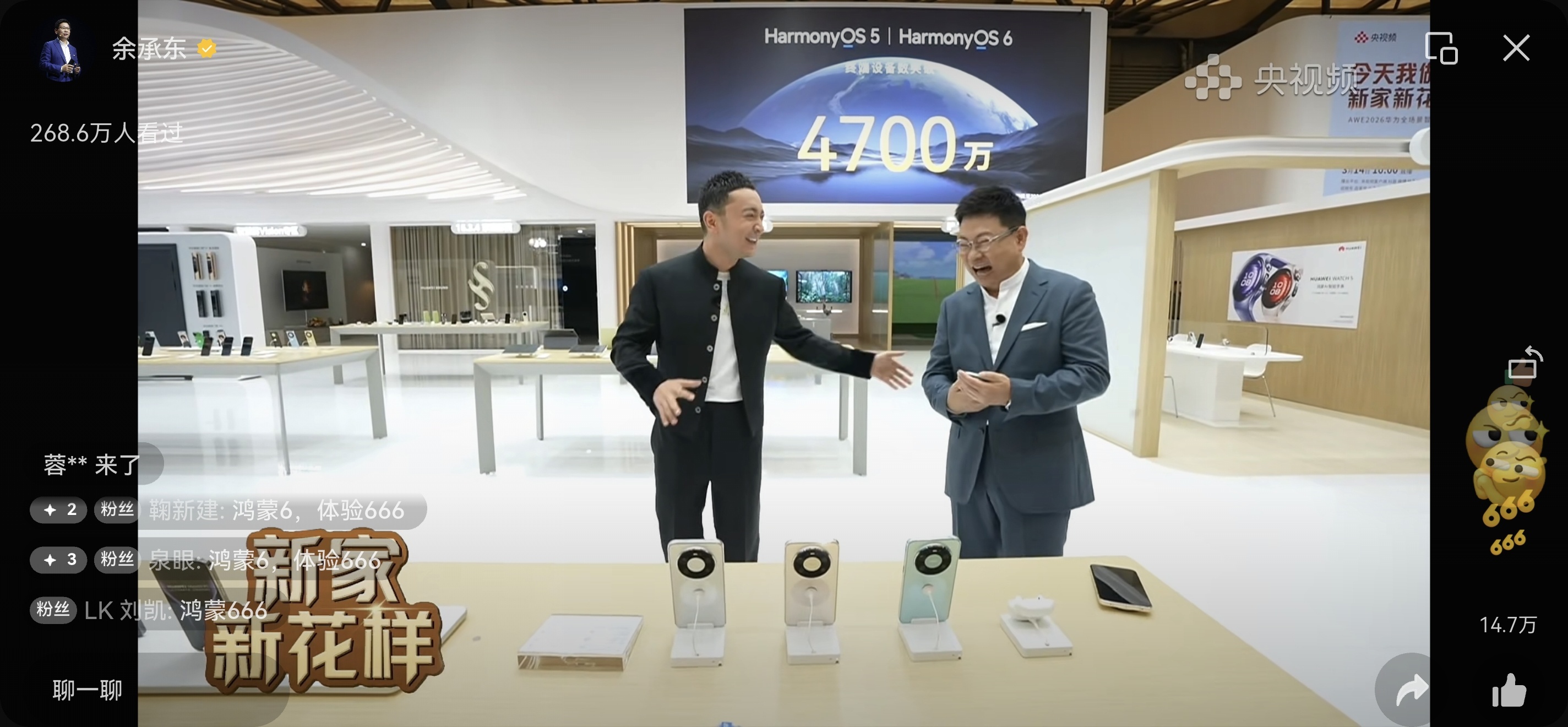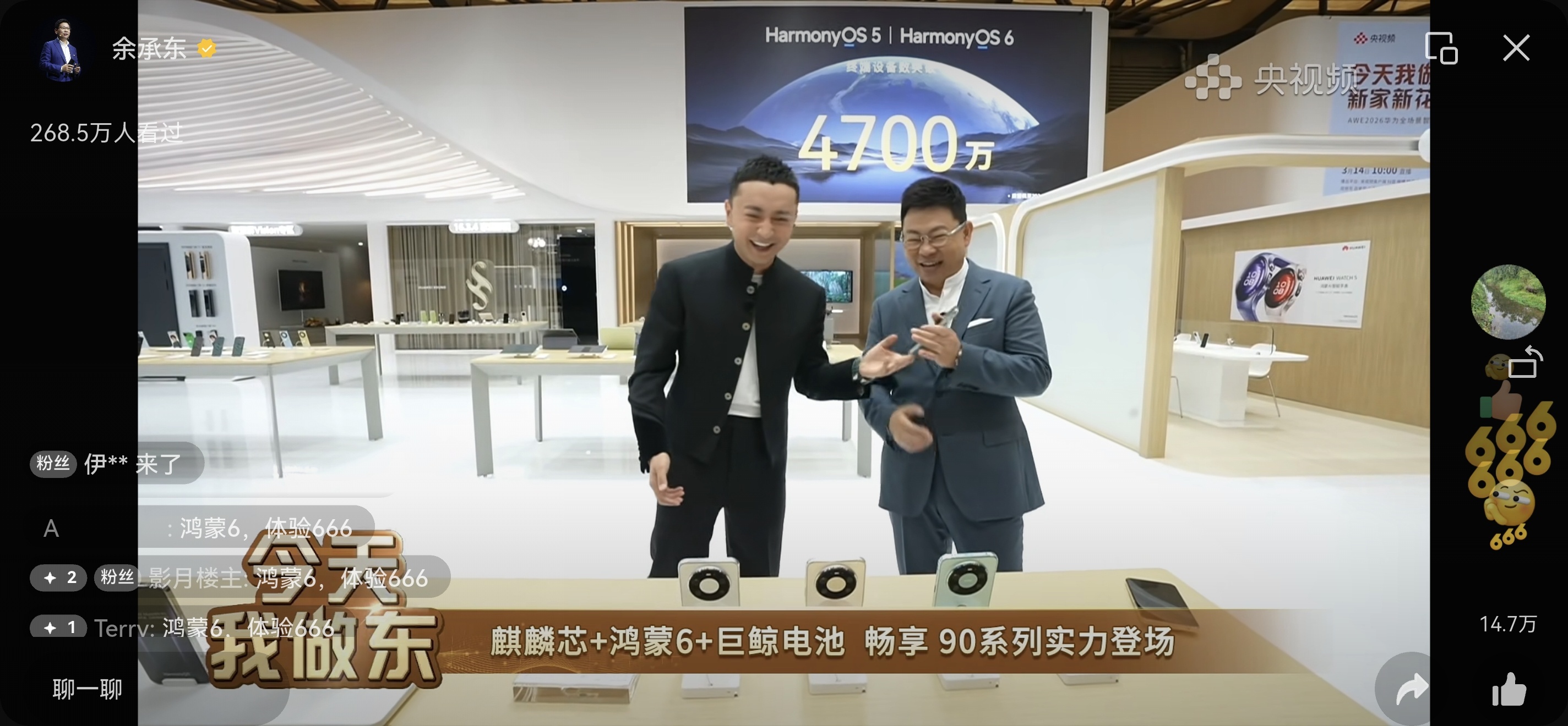 AWE小尼和余承东直播介绍了华为畅享90 Pro Max有麒麟芯片 鸿蒙6和巨鲸电池说月底就发布 这个月新品不少
