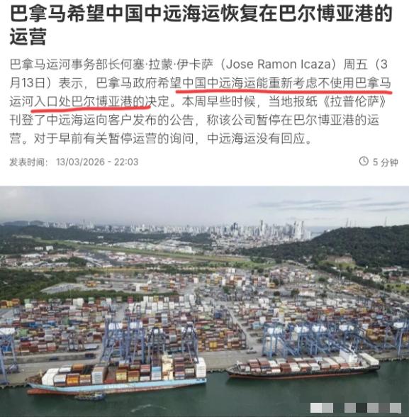 巴拿马政府喊疼了,希望中国恢复在巴尔博亚港的运营!3月14日,根据法新社报道,巴拿马运河事务部长何塞·拉蒙·伊卡萨表示,巴拿马政府希望中国中远海运能重新考虑不使用巴拿马运河入口处巴尔博亚港的决定。中远海运的问题确实让我们有些意外,每一批货物都很重要,中远海运的货物对我们、对巴拿马来说显然尤为重要,我们当然希望他们能重新考虑不使用巴尔博亚港的决定。 很显然,在我们反制巴拿马之后,巴拿马明显是感到疼了。 这事得从几个月前说起,今年1月,巴拿马最高法院突然作出裁决,宣布香港长和集团旗下子公司运营巴尔博亚港和克里斯托瓦尔港的合同“违宪”,直接废除了这份已经履行了近30年的合约。 这份合约有多重要?1997年,巴拿马刚从美国手中逐步收回运河主权,当时这两个港口设施陈旧、运营低效,是长和集团通过国际招标拿下特许经营权,累计投入18亿美元升级改造,才把它们打造成中美洲最繁忙的集装箱港口之一。 这近30年里,这两个港口撑起了巴拿马全国近四成的港口吞吐任务,还创造了上千个直接就业岗位,带动上下游上万人间接就业,长和集团也一直按合同履约,甚至在2021年还顺利续约,把经营权延长到了2047年。 可巴拿马政府却不管这些,今年2月,在没有和长和集团协商、也没有给予任何补偿的情况下,直接强行接管了这两个港口,当天就把巴尔博亚港的临时运营权交给了中远海运的竞争对手——丹麦马士基公司。 这种单方面撕毁合约、无视契约精神的行为,无疑伤害了中资企业的合法权益,中远海运的暂停运营,其实就是一种理性的自保选择。 大家可能不知道,空集装箱是航运业的“周转血液”,没有空箱,后续的装货、中转业务根本没法开展。3月10日,中远海运正式向客户发出通知,全面暂停在巴尔博亚港的业务,不仅取消了所有已确认的订舱,还把港口里所有的空集装箱都调到了巴拿马科隆省的其他码头。 这一下,巴尔博亚港的业务直接被抽走了关键支撑,运营效率大幅下滑,集装箱平均滞港时间延长了好几倍,单日最大吞吐量直接下降了六成多。 巴拿马之所以这么快“喊疼”,核心原因就是它太依赖中资和中国货流了。根据权威数据显示,中国是巴拿马运河的第二大用户,中国货流占运河货运量的21.4%,贡献了28%到30%的通行费收入,而运河收入占巴拿马GDP的7%以上,上一财年巴拿马政府超过20%的财政收入都来自运河运营分红。 中远海运作为全球航运巨头,长期在巴尔博亚港开展业务,相关货运量约占该港口总货运量的4%,看似比例不高,但却是港口稳定运营的重要支撑,尤其是在巴拿马运河受干旱影响、运营本就承压的情况下,中远海运的撤离更是雪上加霜。 科隆自贸区是巴拿马经济的重要支柱,这里60%的货流都依赖巴尔博亚港和克里斯托瓦尔港,中国货流的锐减直接导致自贸区商铺空置率上升,不少依赖中国原材料的加工企业甚至面临停工风险。 而且,巴拿马政府的违约行为,也彻底动摇了国际投资者的信心,包括西门子、现代在内的多家跨国企业,都暂停或取消了在巴拿马的新投资计划,原本计划推进的重大项目也陷入了停滞。 经济学家预估,这次事件可能让巴拿马今年的GDP增速下降1.5至2个百分点,这对一个依赖外资和国际贸易的小型开放经济体来说,无疑是沉重的打击。 除此之外,长和集团也已经启动了国际仲裁,依据国际商会仲裁规则和中巴双边投资保护协定,要求巴拿马政府赔偿至少20亿美元,这笔赔偿相当于巴拿马年度财政收入的近三分之一,一旦仲裁败诉,巴拿马的财政很可能陷入危机。 而且,中方也早已布局了替代方案,秘鲁由中企投资的钱凯港正在加速建设,未来一旦全面运营,将极大削弱巴拿马运河的垄断地位,让中方在南美西海岸的航运布局更加主动。 现在的巴拿马,显然已经意识到了问题的严重性。运河事务部长伊卡萨的喊话,与其说是“请求”,不如说是“补救”,但想要挽回中远海运,想要重建国际投资者的信心,巴拿马要做的绝不仅仅是口头表态。 它必须正视自己的违约行为,与长和集团积极协商,妥善解决合约争议,给予中资企业合理的补偿,真正尊重契约精神,否则,就算中远海运暂时恢复运营,巴拿马也很难再赢得中资企业的信任,后续的经济困境也只会越来越严重。 说到底,这起事件给所有国家都上了一课:在全球化时代,契约精神是国际合作的基石,任何试图践踏规则、透支国家信用的行为,最终都将付出沉重的代价。 巴拿马的“疼”,从来都不是中方造成的,而是它自己亲手种下的苦果,想要止痛,唯有正视错误、弥补过错,这才是唯一的出路。