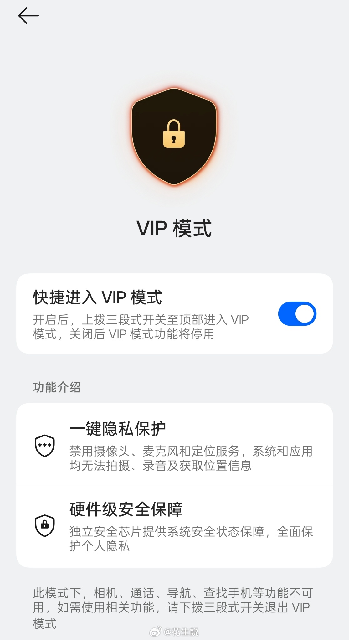 以前OPPO旗舰有一个VIP模式,这可是硬件级的隐私保护可以通过三段式快捷开启,摄像头,麦克风,定位直接给你关闭但对大多数普通消费者来说几乎没有使用场景,而且很多人反馈日常容易误触,所以在后来的系统更新中还给你加入了关闭的选项