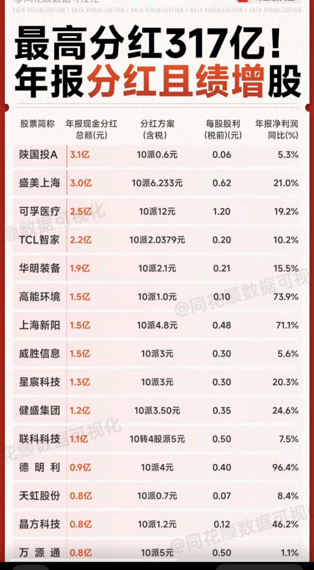 震惊!羡慕! 最高分红317亿! 年报分红且绩效大幅预增股一览! 宁德时代:巨额分红,高达317.5亿元。 工业富联:分红129亿元 宝丰能源:分红30.8亿元 同 花 顺:分红27.4亿元 长期持股,还是高股息高分红公司好! 附绩优高分红股名单:
