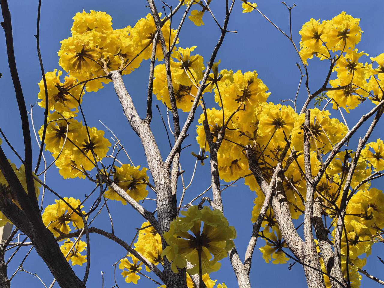 发一张你相册最近拍的花蓝天为背景的黄花风铃木太美了。
