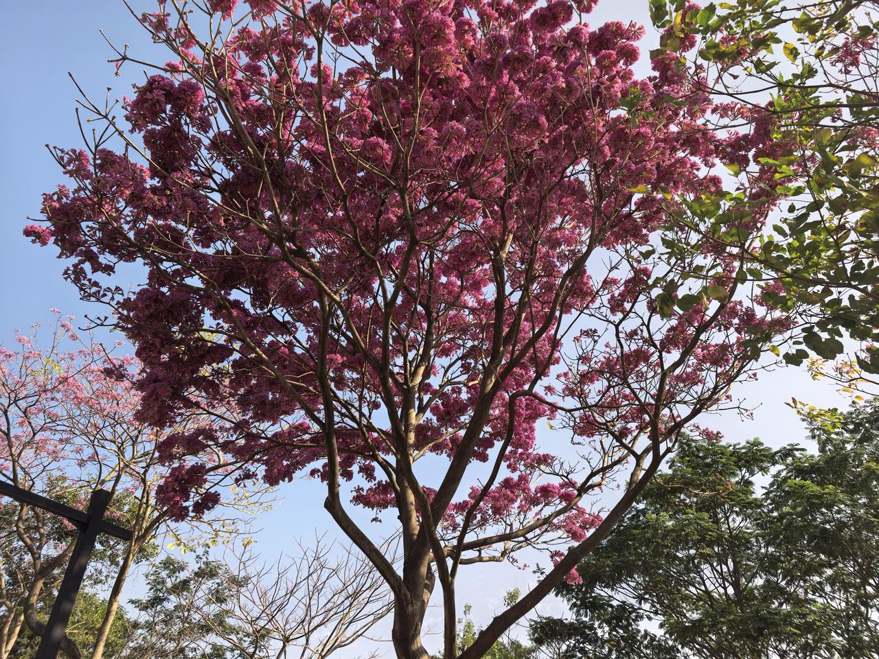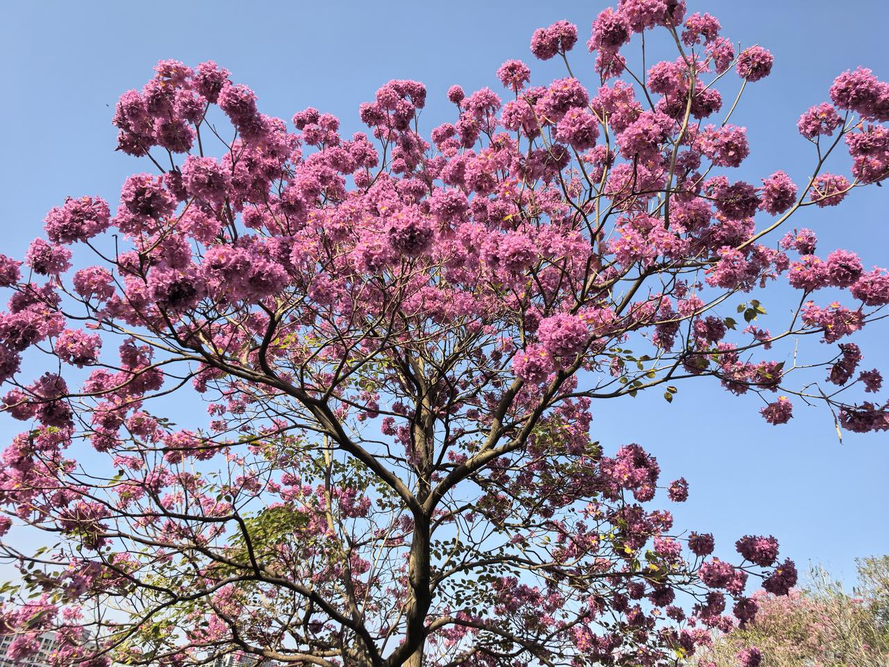 发一张你相册最近拍的花蓝天为背景的黄花风铃木太美了。