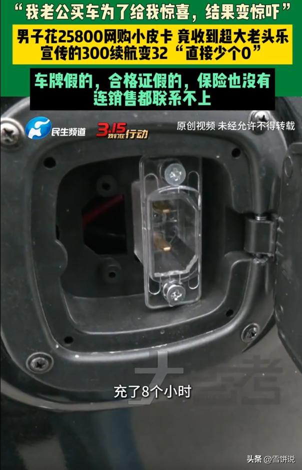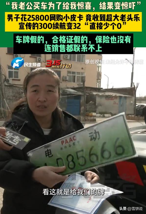惊喜变惊吓了!河南开封,男子花25800元在网上买了一个小皮卡,本打算给妻子接孩子用,也想着给她一个惊喜,结果收到货才发现,就是一个超大的老头乐,车确实很大,可宣传的300公里实际只有32,直接打了一折。这可把女子愁坏了 陈女士购买的这辆老头乐,单看个头还真不小。车身4米5,高度1米8,比路上跑的那些SUV还大一整圈。停在门口,左邻右舍都以为他家真买了辆皮卡拉货用。但走近一瞧,问题就全露馅了 最要命的续航。买车的时候商家拍着胸脯说能跑300公里,陈女士心里还盘算着,这跑个县城来回也够了。结果实际开下来,满打满算只能跑32公里,直接打了个一折 说句不好听的,现在好点的电瓶车续航都比这长。这32公里能干啥?去趟菜市场买个菜都得掂量着电量够不够回来 再就是上牌问题,买车的时候商家承诺得天花乱坠,说包上牌、包上路,交警不管。结果车到了,随车寄来的那张“牌照”陈女士拿手里一摸,差点气笑了 那就是一块铁皮片子,上面印了几个数字,纯粹是商家自己做的道具。合格证更离谱,上面既没有车子品牌,也没有厂家信息,整个一“三无产品”。现在陈女士想找卖家问个明白,结果对方微信不回、电话关机,直接玩起了消失 很多人买这种车图个啥?图便宜、图不用考驾照、图遮风挡雨。但大家忽略了一个最根本的问题:这种车压根就不具备上路的资格 根据法律规定,这种低速四轮车属于机动车范畴,必须列入工信部的目录、必须上牌、驾驶员必须持证 。但市面上卖的那些“老头乐”,大多数是以“观光车”“厂区代步车”的名义申报的,只能在学校、景区、厂区这种封闭场所开,根本不能上公共道路 所以说,消费者真得多个心眼。两万五千八,说多不多,说少也不少。买车之前但凡多问一句“合格证上有没有厂家信息”“这个牌照是车管所发的还是店里自己做的”,可能就不会踩这个坑