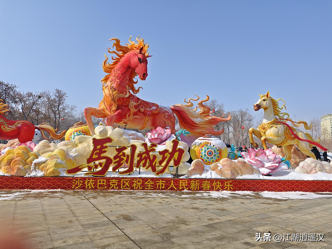 暖暖的阳光下,广场上的人们挽起手、踏着节拍起舞,欢声笑语在清冽的空气里荡漾。雪豹雕塑与“马到成功”花灯相映成趣,红红灯笼串起新春的暖意,各族群众相拥而舞,用最质朴的方式诉说着民族团结一家亲的深情。这是边疆城市最动人的日常,也是刻在心底的温暖与力量。