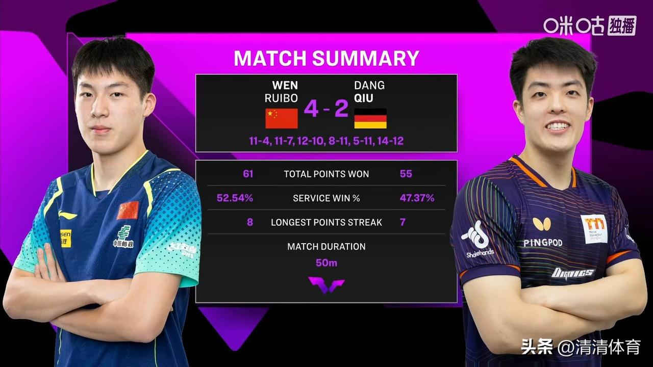 温瑞博以4-2战胜邱党,成功闯入四强。这场球能看出来,他的进攻武器库非常厚实,单板质量、衔接速度、关键球的杀伤力都很突出,面对实力雄厚的对手也敢打敢拼,展现了年轻选手难得的冲击力。 当然,一场精彩的胜利,更重要的是能不能把状态和杀伤力持续稳定下来。年轻选手起伏很正常,如果能把今天这种敢打敢拼、出手果断的特质保持住,未来的空间一定会越来越大。