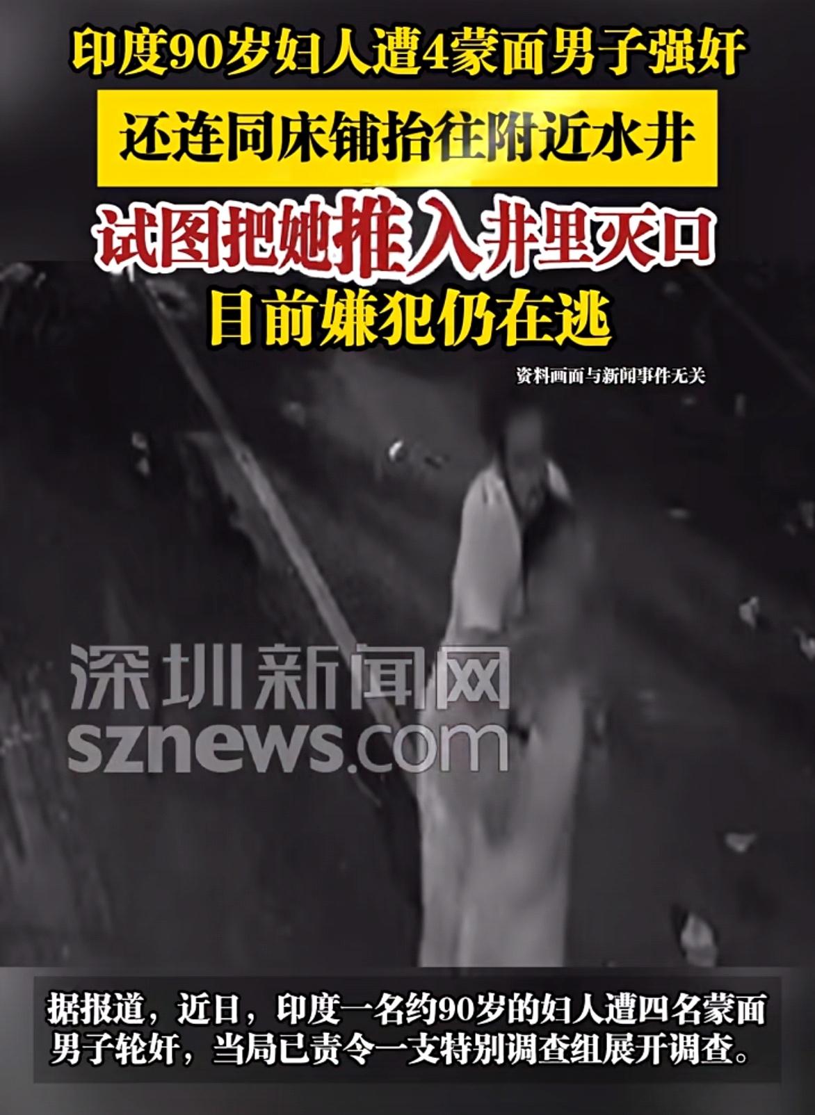 印度90岁老妇遭四名蒙面男子强奸,曾有调侃称变态分四个程度:轻度、中度、重度和印度。 3月5号晚,在印度乡下,一位90岁老妇独自住在小屋里,四名蒙面男子突然闯入。他们将老人捆绑起来,堵住她的嘴,随后对其实施了轮奸。 90岁的老人连走路都不稳,根本无力反抗。施暴结束后,这些歹徒还妄图将老人抬起来扔进井里淹死以杀人灭口,所幸有人路过,他们才仓皇逃窜。 印度强奸 印度 老人虽捡回一条命,但其身心已遭受重创。她本应在这个年纪被悉心照料、安度晚年,却在自己家中惨遭四名壮汉的凌辱与欺侮。
