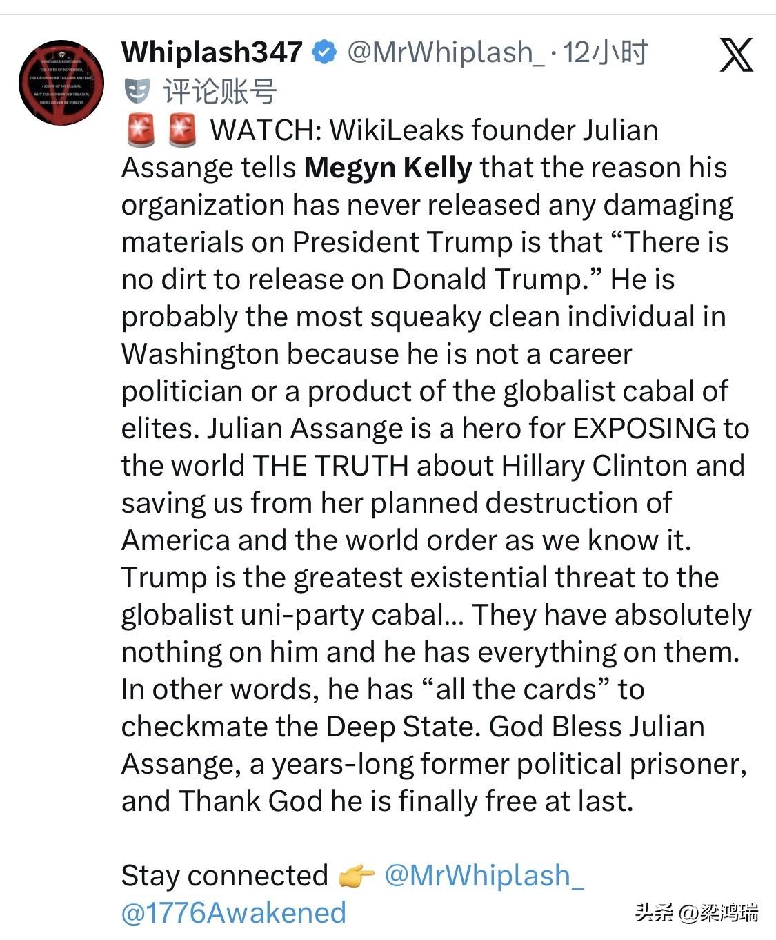 维基解密创始人朱利安·阿桑奇因向世界揭露了希拉里等美国政客的丑闻而成为英雄。梅根.凯莉问他,如果有川普的丑闻,你们会公布吗?阿桑奇回答:会的,我们不管民主党还是共和党。但川普没有可披露的污点。川普可能是华盛顿最清廉的人。因为川普原来既不是从政者,也不是全球精英集团的产物。 梅根·凯利(Megyn Kelly,1970年11月18日—)是美国知名的政治评论员、主播及前律师。她曾先后在福克斯新闻(Fox News)和全国广播公司(NBC)担任王牌节目主持人,目前活跃于数字媒体平台,主持其个人品牌节目《梅根·凯利秀》(The Megyn Kelly Show)。
