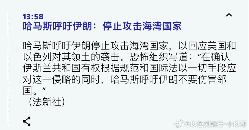 伊朗被抛弃了哈马斯实际上表达的意思是,伊朗别打阿拉伯人了。毕竟哈马斯也是阿拉伯人,还是逊尼派,看来比什叶派的阿拉伯人真主党更觉得哈梅内伊二世疯了。海外新鲜事 伊朗被小兄弟骂了,另一个小兄弟胡塞也不帮忙,在本地区彻底被孤立。