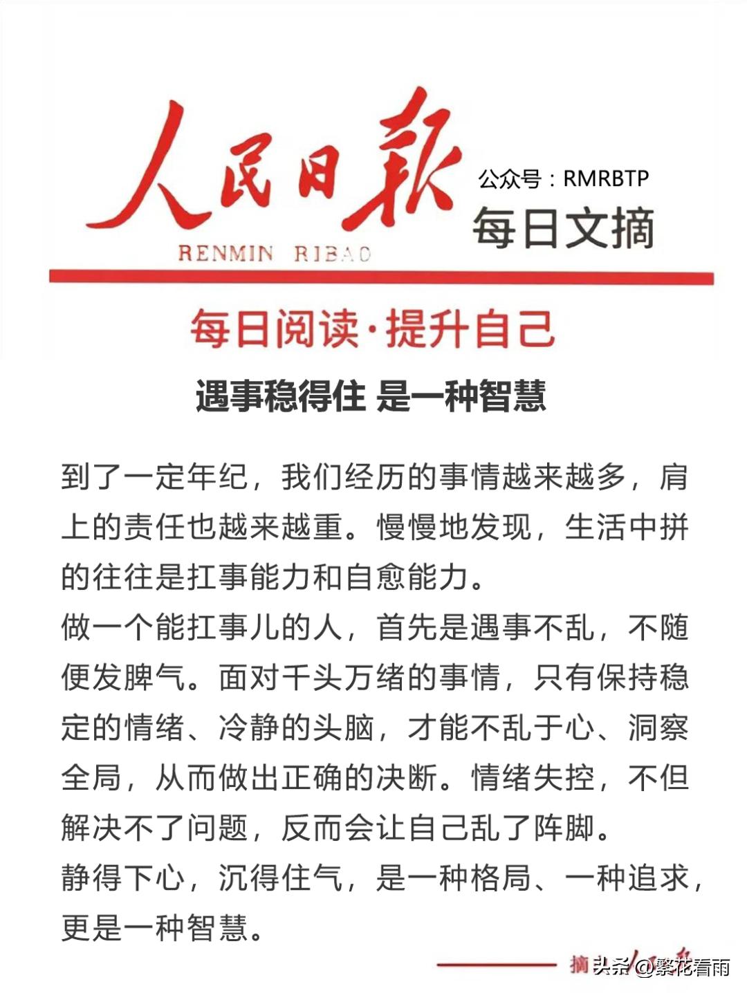 到了一定年纪,我们经历的事情越来越多,肩上的责任也越来越重。慢慢地发现,生活中拼的往往是扛事能力和自愈能力。 做一个能扛事儿的人,首先是遇事不乱,不随便发脾气。面对千头万绪的事情,只有保持稳定的情绪、冷静的头脑,才能不乱于心、洞察全局,从而做出正确的决断。 情绪失控,不但解决不了问题,反而会让自己乱了阵脚。 静得下心,沉得住气,是一种格局、一种追求, 更是一种智慧。