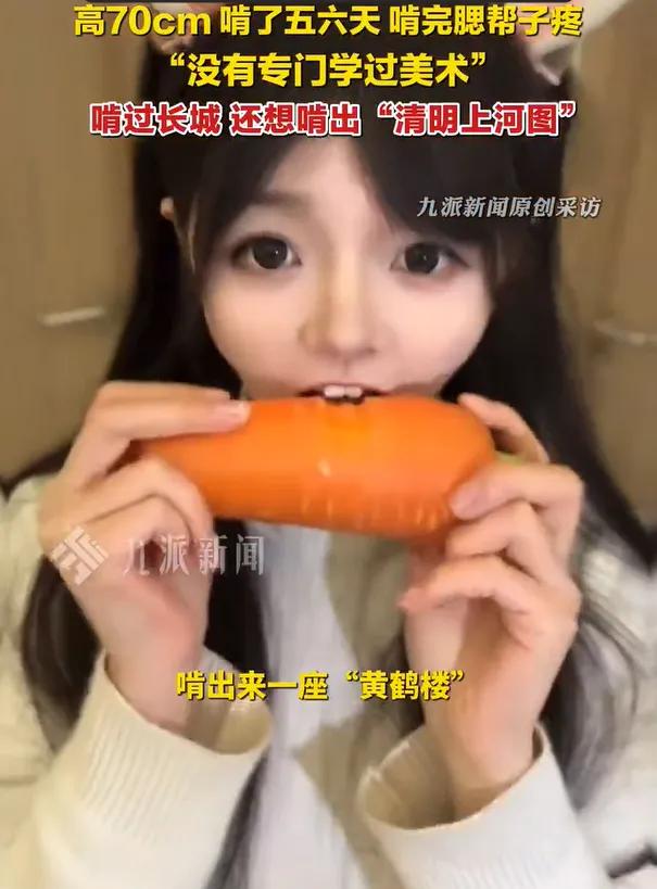 啃雕胡萝卜女孩称没学过美术 ​3月13日报道,湖北恩施。女孩用胡萝卜啃出“黄鹤楼”引发关注。3月12日,博主“优点点”告诉九派新闻记者,这座“黄鹤楼”高70多厘米,啃了五六天。“优点点”称,自己没专门学过美术,啃完的作品一般先泡水保存,大点的零件还能去皮吃,不能吃的就喂猪喂鸡。她表示,今后还想啃“清明上河图”等作品。 湖北恩施25岁女孩陈琴,因用牙齿啃雕胡萝卜、创作出栩栩如生的“万里长城”等作品,在网络上引发关注。她自称全网“牙雕”第一人,创作全程不借助任何刻刀、刻针等工具,仅用牙齿完成,被网友戏称“嘴里藏了台3D打印机”。 【唐】•李白 故人西辞黄鹤楼,烟花三月下扬州。 孤帆远影碧空尽,唯见长江天际流。 故人原型【孟浩然】 在这个ai盛行的时代,博主也不手搓,依旧坚持纯嘴啃。 明明可以靠颜值,却要靠口肯。😂😂 挺有创意的,就是感觉萝卜上有口水。🐷 有人认为 最不值钱的就是颜值,必须另辟奇径。 前世应该是月宫里陪着嫦娥的兔子。兔子和河狸来了都得认输😄玉兔姐姐,你啃胡萝卜不要紧,不要把它啃涨价了。😅😅 没亲眼看见全程我是不信、怎么可能这么整齐。🌚 网友表示: 我一开始也不信,但是她真直播啃完全程。🌚过年的时候 她直播啃 我足足看了三四个小时。🤦🤦🤦 这“牙雕”创意绝了!把“牙雕”的字面意思发挥到极致。得有多大的耐心,才能把一根胡萝卜啃成艺术品?我可能啃着啃着就变成贪吃蛇了,最后全进了肚子。佩服这份执着!