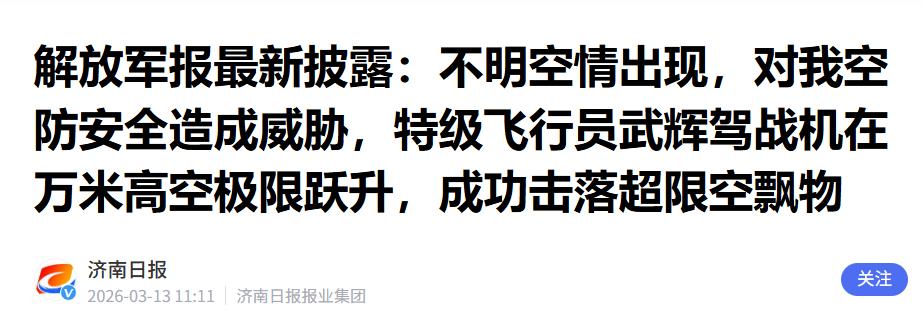 非法闯入我国领空?绝不能留!果断击落! 3月13日,《解放军报》等官方媒体披露了一场教科书式的领空捍卫行动:我国空军特级飞行员武辉,面对威胁空防安全的不明空情,驾驶战机直冲万米高空,以极限跃升操作精准击落非法闯入我国领空的超限空飘物,圆满完成处置任务。 这句话里面的超限空飘物,说白了,就是越过了国家规定的飞行范围、不符合管控标准,擅自闯入我国领空的空中漂浮物。 它不是我们平时玩的风筝、气球,也不是正常的气象探测设备,这种空飘物雷达回波小、飞得慢,路线还飘忽不定,很难被发现和跟踪,而且一旦进入我国敏感空域,危害极大。 大家可别小看这种飘在空中的东西,它的危害一点都不小。首先,它会严重威胁我国飞机的飞行安全,不管是民航客机还是军用战机,一旦撞上这种空飘物,或者被它的绳索缠上,就可能造成发动机损坏、仪表失灵,甚至引发机毁人亡的严重事故。 其次,这种超限空飘物还有可能挂载侦察设备,偷偷搜集我国的空防数据和相关情报,给国家的安全带来隐患。另外,它飘在空中没有固定路线,一旦失控坠落,还可能砸到地面的建筑和人员,造成不必要的损失。 这次被击落的超限空飘物,就是偷偷闯入我国领空的“不速之客”,当时它已经对我国的空防安全造成了明确威胁。接到空情通报后,我国空防值班系统立刻启动,指挥链畅通无阻,信息流转没有丝毫延迟,很快就下达了升空处置的指令。而负责执行这次任务的,就是空军特级飞行员武辉。 武辉是一名80后特级飞行员,有着多年的飞行经验,平时训练刻苦,技术精湛,战友们都称他为“藏经阁里的扫地僧”,意思是他话不多,但战术眼光独到,处置特情果断精准,每次执行任务都能做到万无一失。 他所在的部队是空军的“尖刀力量”,驻扎在祖国西南边陲,担负着守卫祖国领空的重要使命,部队里的战机都印着红鹰标识,被称为“云岭红鹰”。 接到指令的那一刻,武辉没有丝毫慌乱,立刻赶到战机旁,在机械师的配合下,一丝不苟地检查战机,确认各项设备正常后,迅速登机、启动战机。随着指令下达,战机呼啸着冲上蓝天,朝着不明空情出现的方向飞去。 当时的任务难度不小,一方面,超限空飘物本身很难捕捉,雷达跟踪难度大;另一方面,要飞到万米高空处置,那里空气稀薄,会影响战机的发动机推力,飞行员的操控空间也会大大缩小,对飞行员的技术和心理素质都是极大的考验。 武辉驾驶战机一路攀升,很快就抵达了万米高空。他凭借丰富的飞行经验和精湛的操控技术,快速搜索目标,精准锁定了那架非法闯入的超限空飘物。 面对飘忽不定的目标,武辉沉着冷静,准确判断目标轨迹,果断实施极限跃升操作——就是驾驶战机以最快速度提升高度,抢占最佳攻击位置,不给目标任何逃脱的机会。 整个处置过程干净利落,没有丝毫拖沓。武辉精准操控战机,找准最佳时机,果断发起攻击,成功将超限空飘物击落。 击落之后,他没有立刻返航,而是在该空域继续巡逻,确认没有其他伴随目标,也没有残留碎片会影响后续航班飞行后,才驾驶战机平稳返航,圆满完成了这次领空捍卫任务。 事后,武辉在接受采访时说,处置这种不明空情,不能用“难不难”来形容,而是要自问研究得“深不深”,有没有信心去执行好任务。 这句话看似简单,却道出了中国空军飞行员的责任与担当。这次任务,不仅体现了武辉个人过硬的技术和心理素质,更展现了我国空防体系的高效运转——从雷达发现目标,到指挥中心下达指令,再到飞行员升空处置,整个流程环环相扣、无缝衔接,没有丝毫延误,这就是中国空军的实力。 这次武辉果断击落非法闯入的超限空飘物,就是一次最直接的证明:中国空军有能力、有决心捍卫国家领空安全,任何试图非法闯入我国领空的行为,都将受到严厉反击。武辉和无数像他一样的空军飞行员,日复一日地刻苦训练,坚守在自己的岗位上,就是为了在关键时刻能够挺身而出,守护好祖国的蓝天。 这件事虽然只是一次普通的领空处置行动,却从一个侧面反映出,我国的空防能力已经越来越强,我们有足够的实力应对各种空防威胁。不管是海上的挑衅,还是空中的侵扰,中国人民解放军都能从容应对、果断反击。 最后,我们要明确一点:我国的领空、领海、领土,神圣不可侵犯。任何国家、任何势力,都不要试图挑战我们的底线,不要以为一些“擦边球”式的小动作就能蒙混过关。只要敢非法闯入,我们就敢果断出手,绝不留情。 武辉的果断处置,就是中国空军的态度,也是中国人民的态度——朋友来了有美酒,若是那“豺狼”来了,不管是空中的、海上的,迎接它的,必定是我们的“猎枪”。今日中国空军的冷静与专业,就是我们最硬的底气!