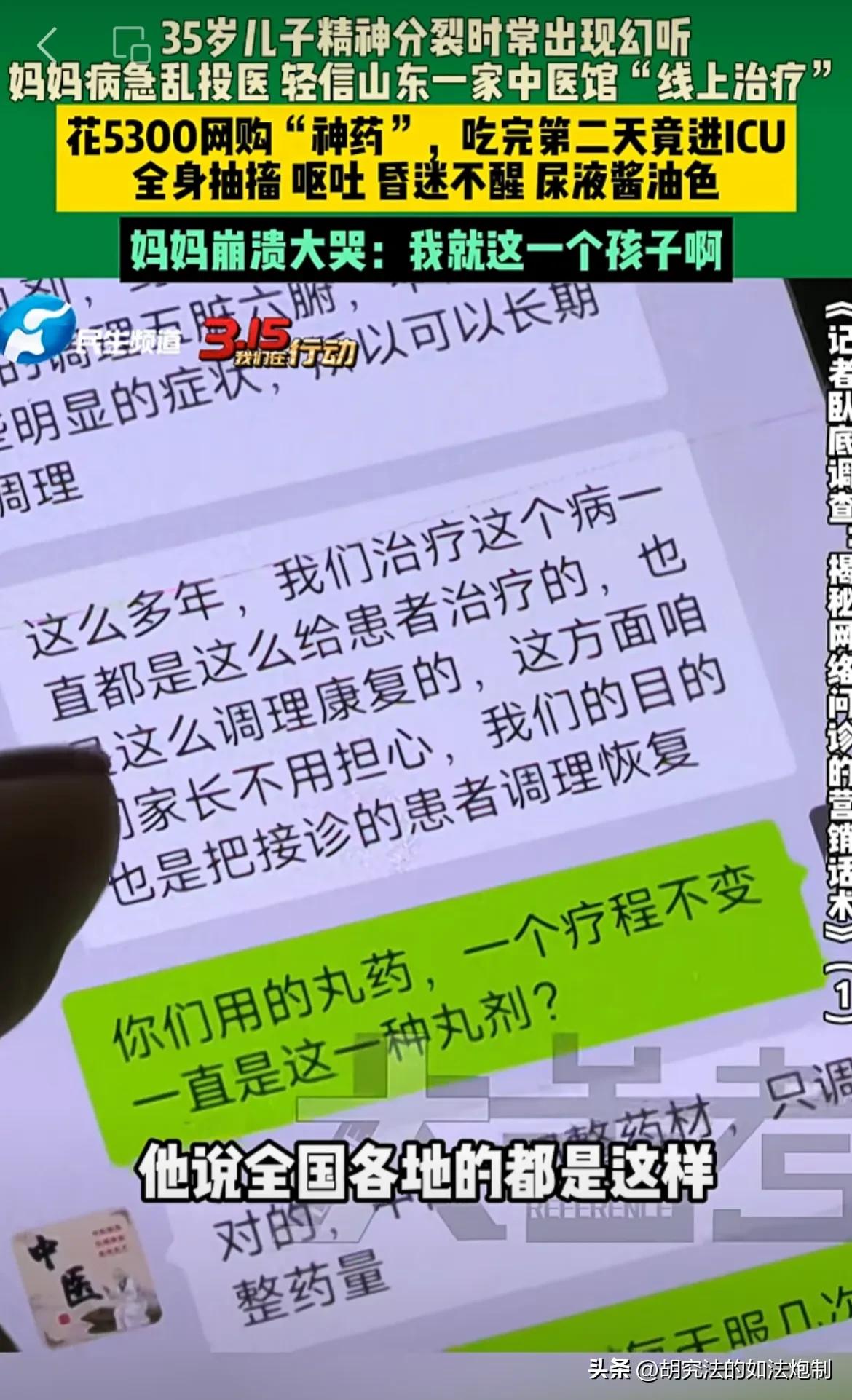河南新乡,一35岁男子时常出现幻听,母亲病急乱投医,轻信中医馆的“线上治疗”,花了5300元买了药。谁曾想,男子服药第二天,便全身抽搐、呕吐、昏迷不醒,被紧急送往ICU。母亲哭诉:我就这么一个孩子…… 如果能换来孩子的健康,相信每一位父母都会拼尽全力。可河南新乡一位母亲的经历,让人看了却气愤不已。 事情的大致是这样。女子年轻的时候为了给孩子更好的条件,便只要了一个孩子。没想到等孩子20多岁的时候,竟然患上了精神分裂。 女子差点崩溃。自己含辛茹苦把孩子养大,正是到了工作成家的时候,没有想到竟然得了这种病。 别说是娶媳妇儿了,就连生活也成了问题。由于孩子犯病时没有自主意识,担心孩子出意外,女子只能一直陪在孩子的身边。 为了给孩子治病,家里为数不多的积蓄早就被掏空了,可辗转多家医院,孩子的病情并没有任何的好转。 更糟糕的是,随着年龄的增长,也就是35岁的时候,儿子的精神状态更不好了,经常胡言乱语,还出现了失眠的情况。 这可把女子吓坏了,连忙带着儿子去医院检查。 医生告诉女子,可能是由于精神分裂的缘故,他的儿子出现了幻听,如果不及时进行治疗的话,儿子的病情将会越来越严重。 都说病急乱投医,女子也犯了这个毛病。 现如今网络发达,女子时常通过手机查找一些这方面的信息,还真被他找到了一家位于山东的中医药馆。 从宣传视频上来看,这家中医馆到处挂满了锦旗,经过这里治疗康复的患者不计其数,更是有个别的患者对医生感激涕零,场面相当感人。 女子抱着试试看的态度主动联系了对方,在说明儿子的病情之后,对方表示这个病他们能治。 只要能按照他们的要坚持服用的话,不仅能恢复健康,以后结婚生子也不是什么问题。 女子听完心里很激动,当父母的不可能照顾孩子一辈子。等他们年龄大了之后,也希望孩子能有人来照顾。 对方干脆的回答,无疑让女子重拾信心,赶紧询问对方到底该怎么治疗。 对方告诉女子,考虑到病情比较复杂,需要进行调理,时间大概是20天到30天左右,并建议女子先拿点药试试看。 女子也没有多想,花了5300元拿药,并按照医生的嘱咐给儿子服下。 女子本以为慢慢的调养之后,儿子可能会慢慢好起来。可让他没想到的,儿子刚服药没多久,就出现了呕吐的现象。 起初女子还以为是儿子吃坏了什么东西,可接下来,儿子便开始浑身抽搐,出现了昏迷不醒的情况。 可把女子给吓坏了,赶紧把孩子送到了医院。医院经过简单的检查后,询问女子给孩子吃过什么东西。 女子于是把自己从网上花5300块钱买药给儿子,并给儿子服下的事情告诉了医生。 医生听完眉头不禁皱了皱,考虑到情况紧急,又将其送进了重症监护室。 本想花钱给儿子治病,没有想到却让孩子的病情更加严重了。每当想起来自己做的这件糊涂事,女子更是后悔莫及。 如果女子相信中医,完全可以到当地的中医院去看一看,怎么可以轻信网上的那些中医馆呢?对方仅凭女子的只言片语就能给孩子抓药,想想就觉得不靠谱。 这样的中医诊所实在是太坑人了,可怜天下父母心,如果不是为了孩子,没有父母会上当受骗的。 《刑法》第一百四十二条规定,生产、销售劣药,对人体健康造成严重危害的,处三年以上十年以下有期徒刑,并处罚金;后果特别严重的,处十年以上有期徒刑或者无期徒刑,并处罚金或者没收财产。 黑心医生为了那点利益,根本不管不顾他人的死活,简直是一点道德也不讲了!女子当下最应该做的就是赶紧报警,并且索要赔偿。 对此你怎么认为?