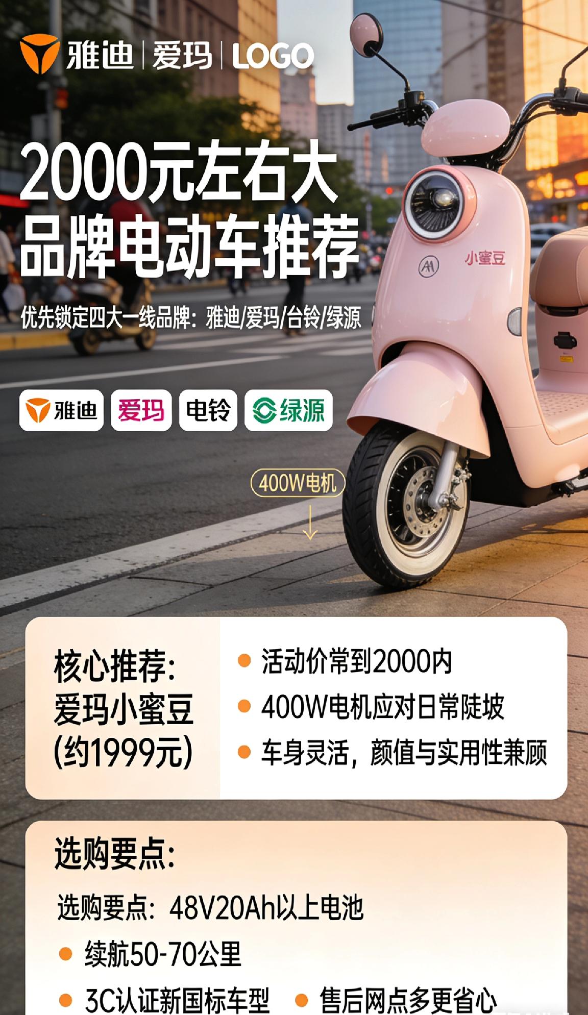 2000元左右选大品牌电动车,优先锁定雅迪、爱玛、台铃、绿源四大一线品牌,品控与售后更有保障。 核心推荐 - 雅迪小金果PLUS(1999元):新国标车型,48V20Ah电池续航60-70公里,加厚坐垫+前液压减震,通勤舒适,一线品控放心。 ​ - 爱玛小蜜豆(约1999元):活动价常到2000内,400W电机应对日常陡坡,车身灵活,颜值与实用性兼顾。 ​ - 台铃小核桃(1899元):云动力省电系统加持,续航更优,实测低温下也能保持良好续航,性价比突出。 ​ - 绿源MOK(2000出头):液冷电机10年质保,陶瓷刹车耐用,一周充一次电,通勤接娃都合适。 选购要点 优先选48V20Ah以上电池,关注续航50-70公里、3C认证新国标车型,售后网点多更省心。(个人观点,仅供参考) 电动车推荐 2000元电动车
