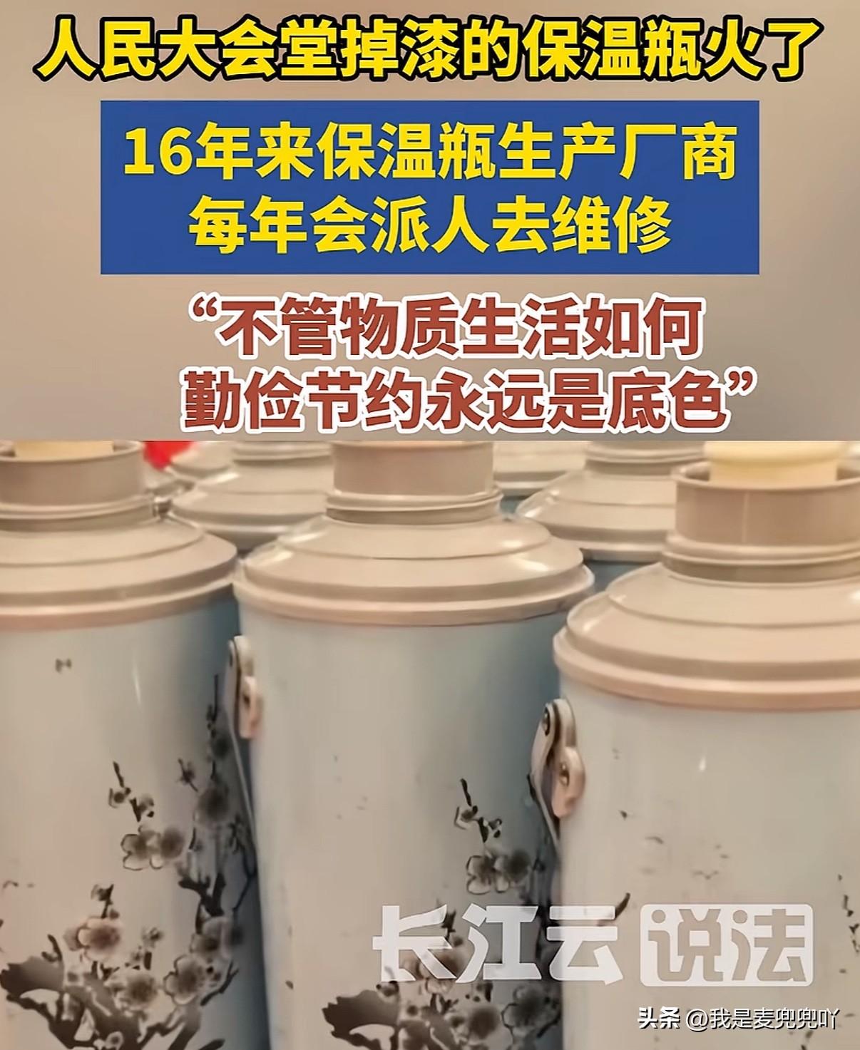 好感动已经看哭我了 人民大会堂暖水瓶掉漆了还在用,不管物质生活如何改善但勤俭节约才是永远的底色 这款10几年前的暖水瓶很多普通家庭都淘汰不用了但人民大会堂还在用,而且很多暖水瓶已经磨损掉漆 全国两会召开期间有记者发现北京人民大会堂的老式暖水瓶吸引目光,按照品牌跟生产型号记者查到这些暖水瓶是浙江一家企业生产的,已经16年了,虽然现在已经不生产了但每年依然会派专人前往北京对坏掉的暖水瓶进行维修,并表示不管物质生活怎样勤俭节约才是值得大家学习的榜样