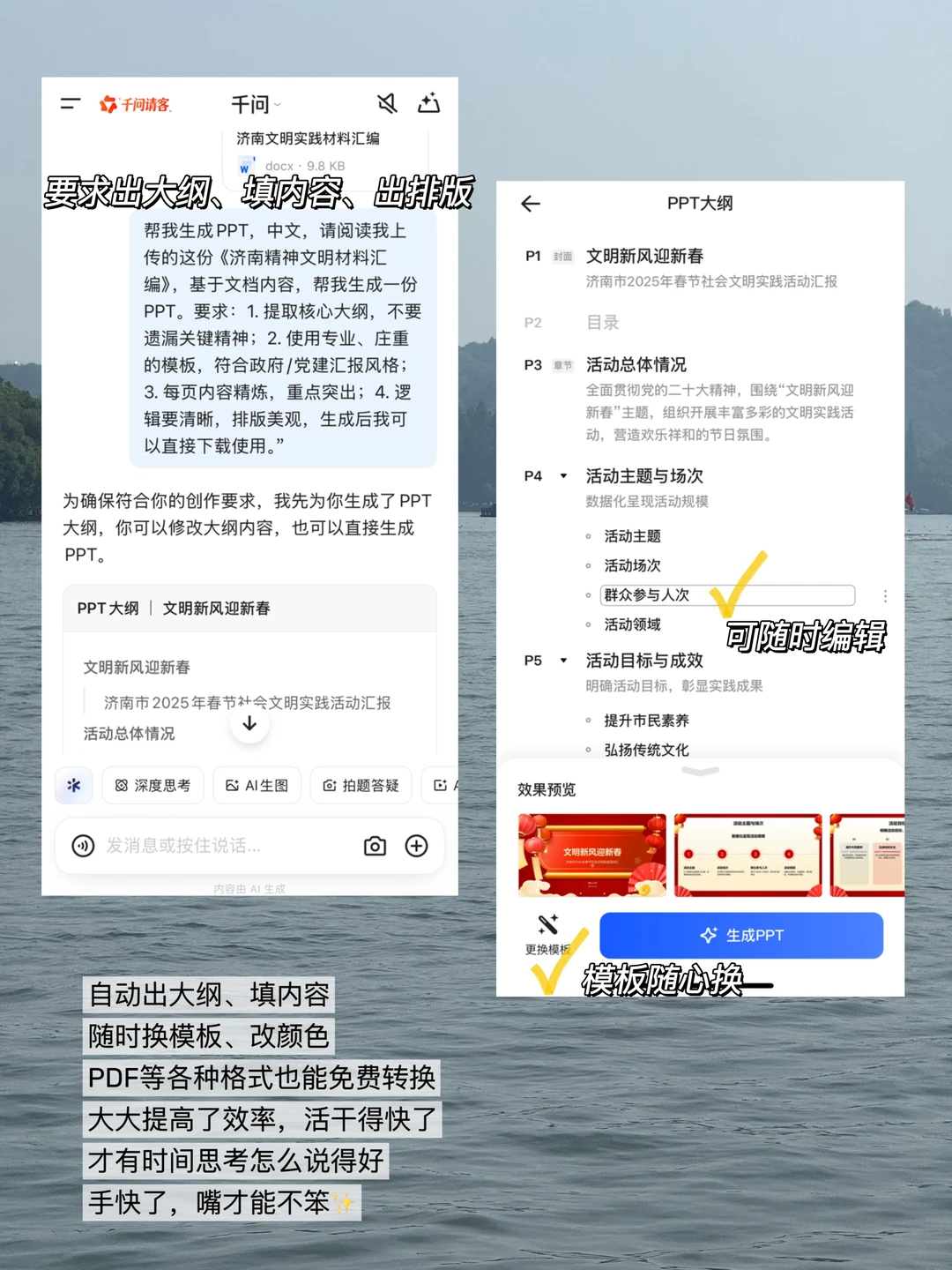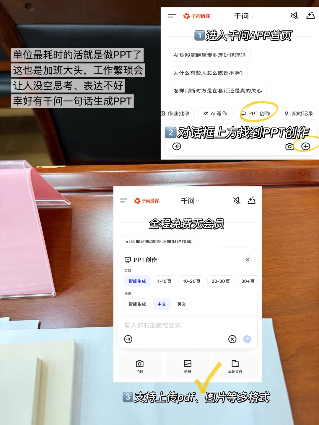✓工作提效。单位最耗时的就是做PPT了,是加班大头。现在有千问一句话就能生成PPT,自动出大纲、填内容,随时换模板、改颜色,PDF等格式也能免费转换。大大提高工作效率,活干得快了,才有时间思考怎么说好。手快了,嘴才能不笨