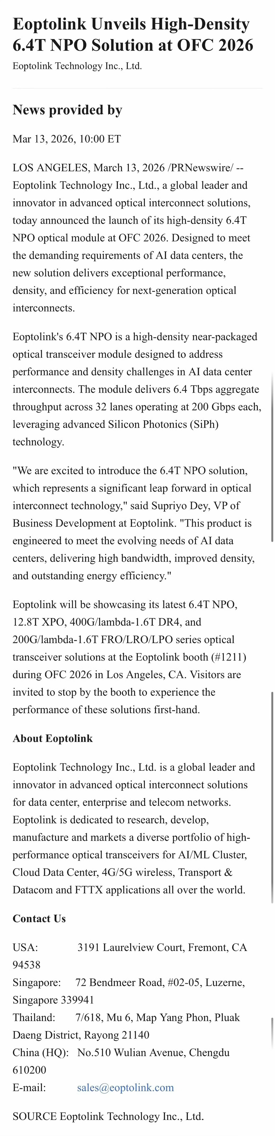 在OFC 2026(3.15-3.19)大会上,Eoptolink Technology(新易盛)发布高密度 6.4T NPO(Near-Packaged Optics)光模块方案,瞄准AI数据中心高速互连需求。