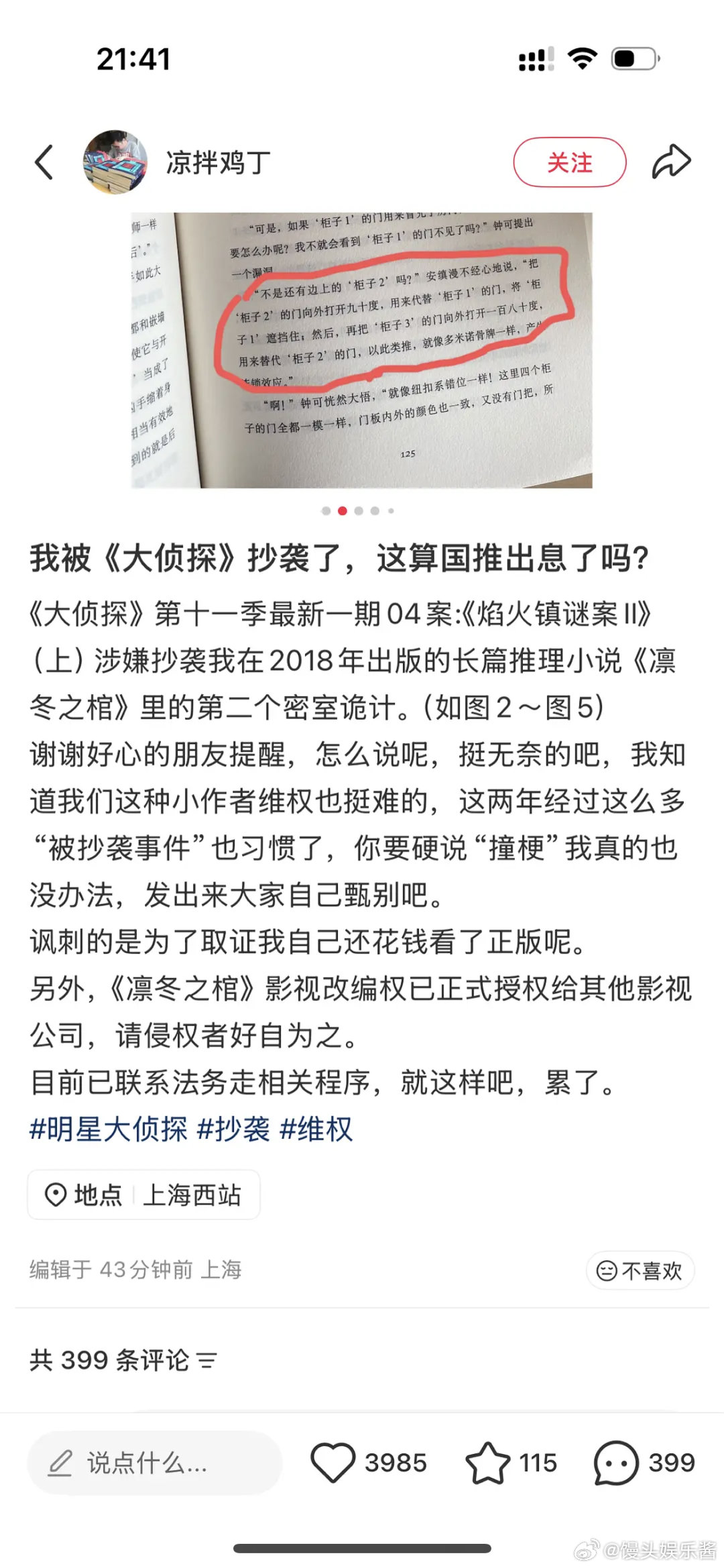 大侦探最新一案抄袭,作者wq居然被节目粉说“被抄你应该感到幸福”