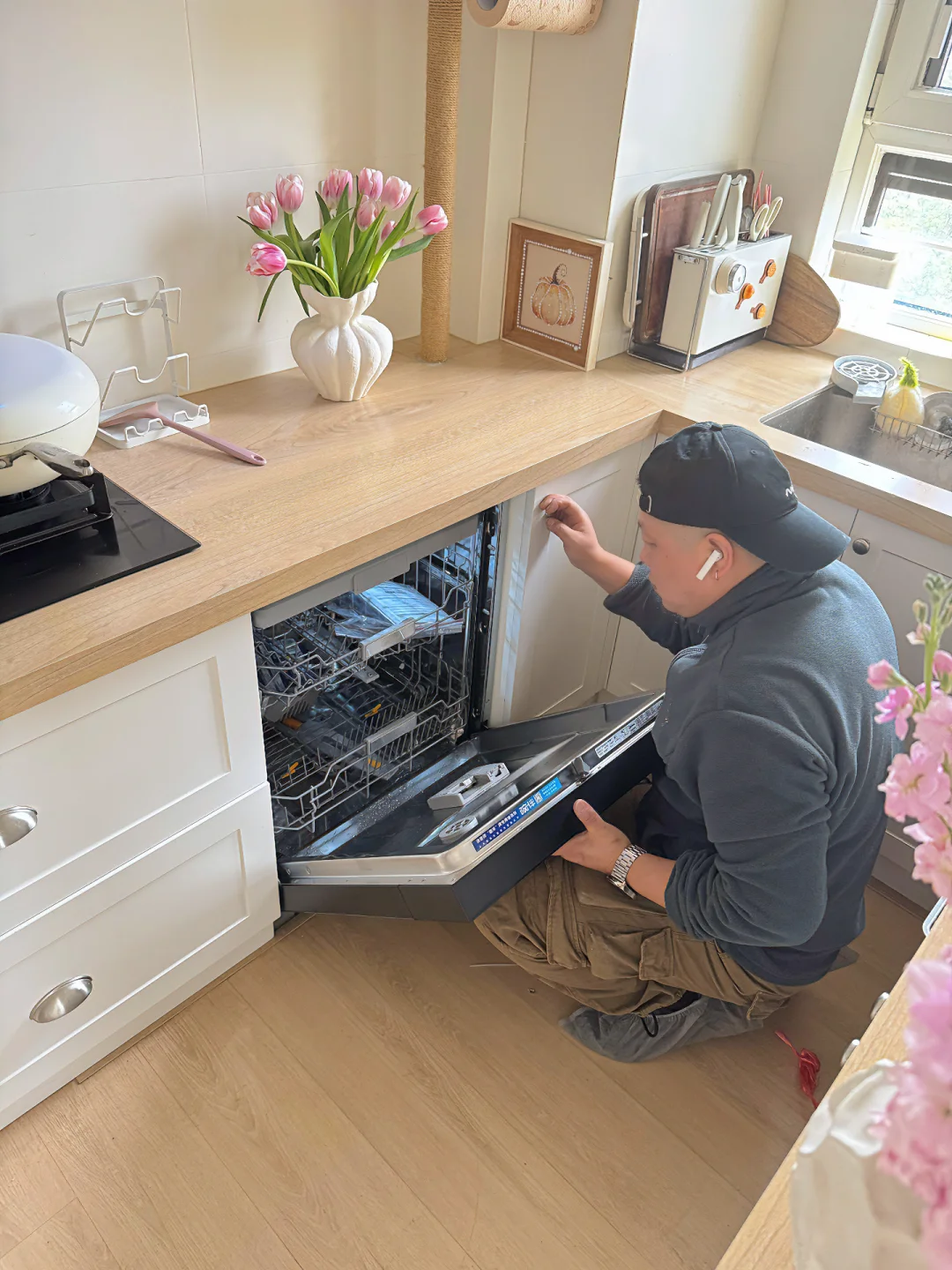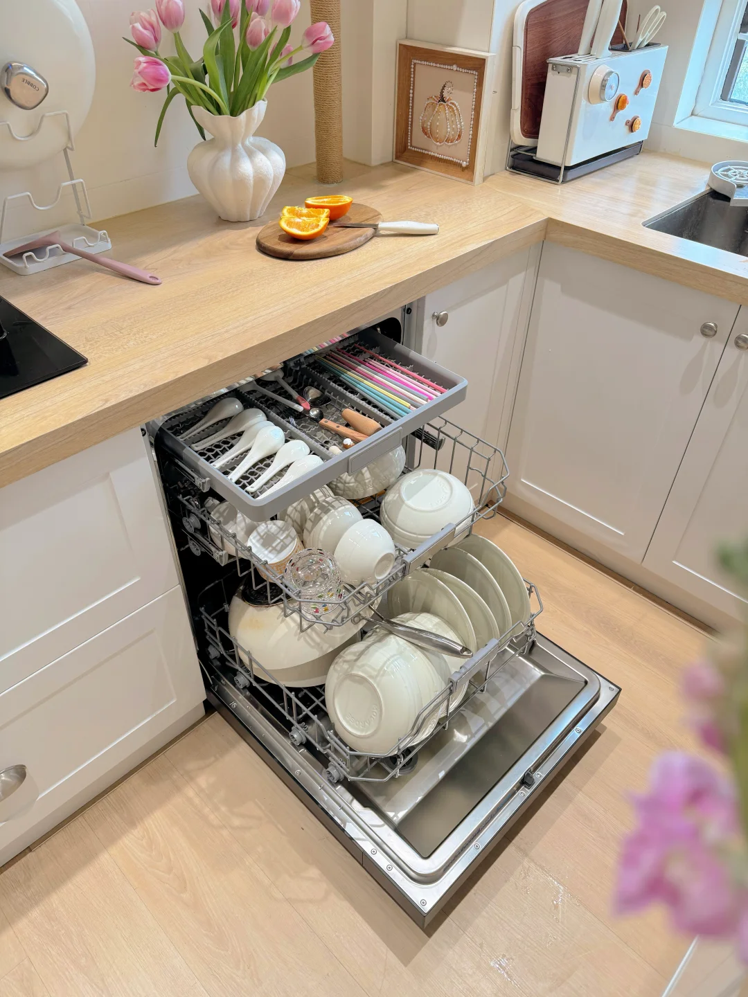 再就是当初装修的时候留好位置做嵌入式家电,我家在水槽旁边特意留了洗碗机的位置,尺寸和橱柜刚好严丝合缝,尺寸提前跟店铺和师傅聊好了就行,就不会突出来一块🥳
