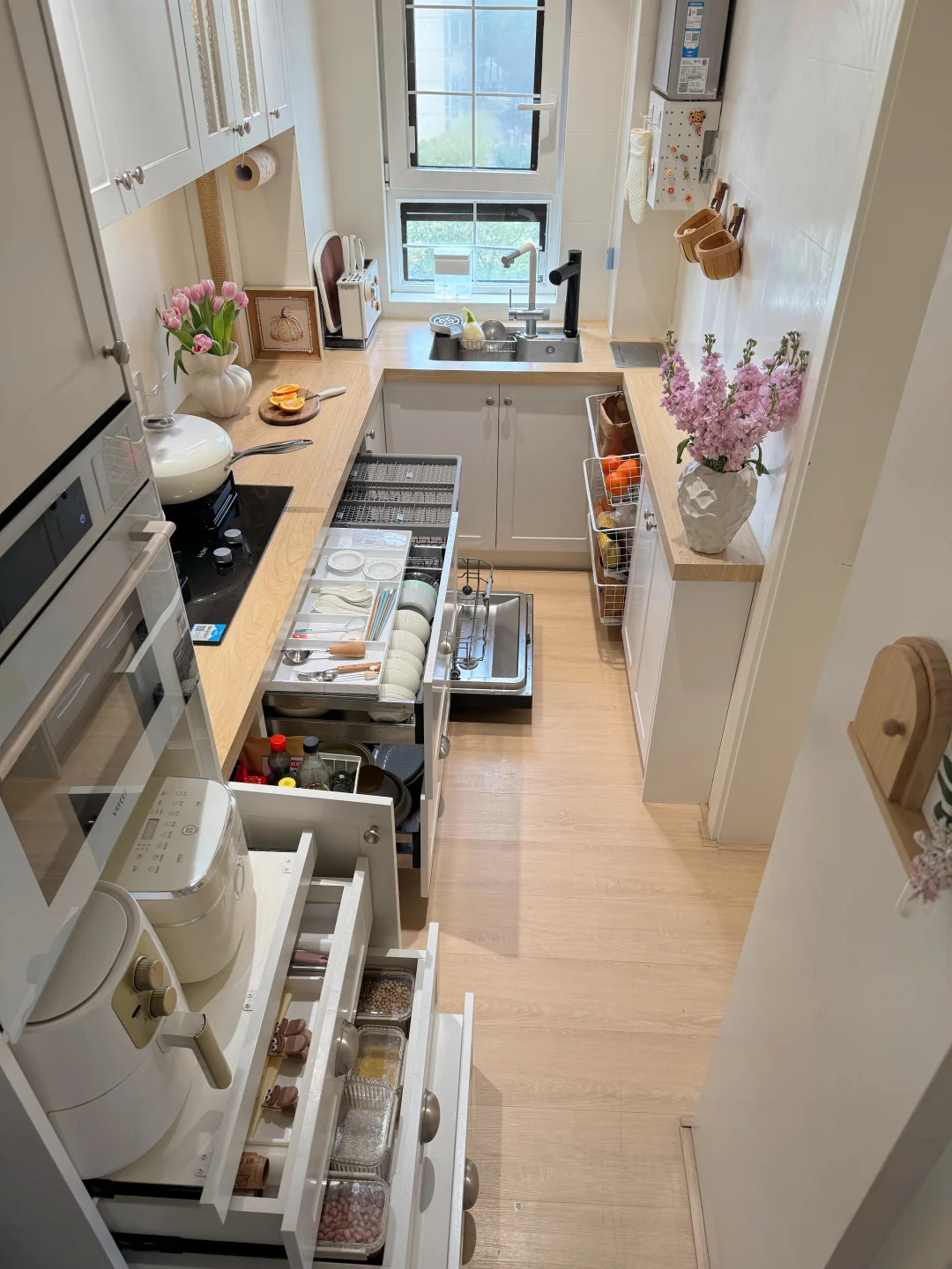 小厨房设计U型布局,可以做到这些,尊嘟很方便!旁边再安排一个窄边柜,DIY上果蔬拉篮存放果蔬,收纳更简洁呢✨再 利用纵向空间做一组电器高柜,家电、工具、囤货通通装得下,台面整洁也不显乱!