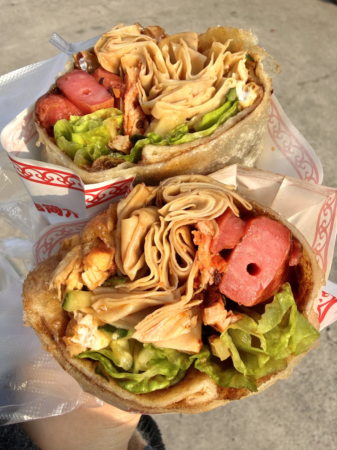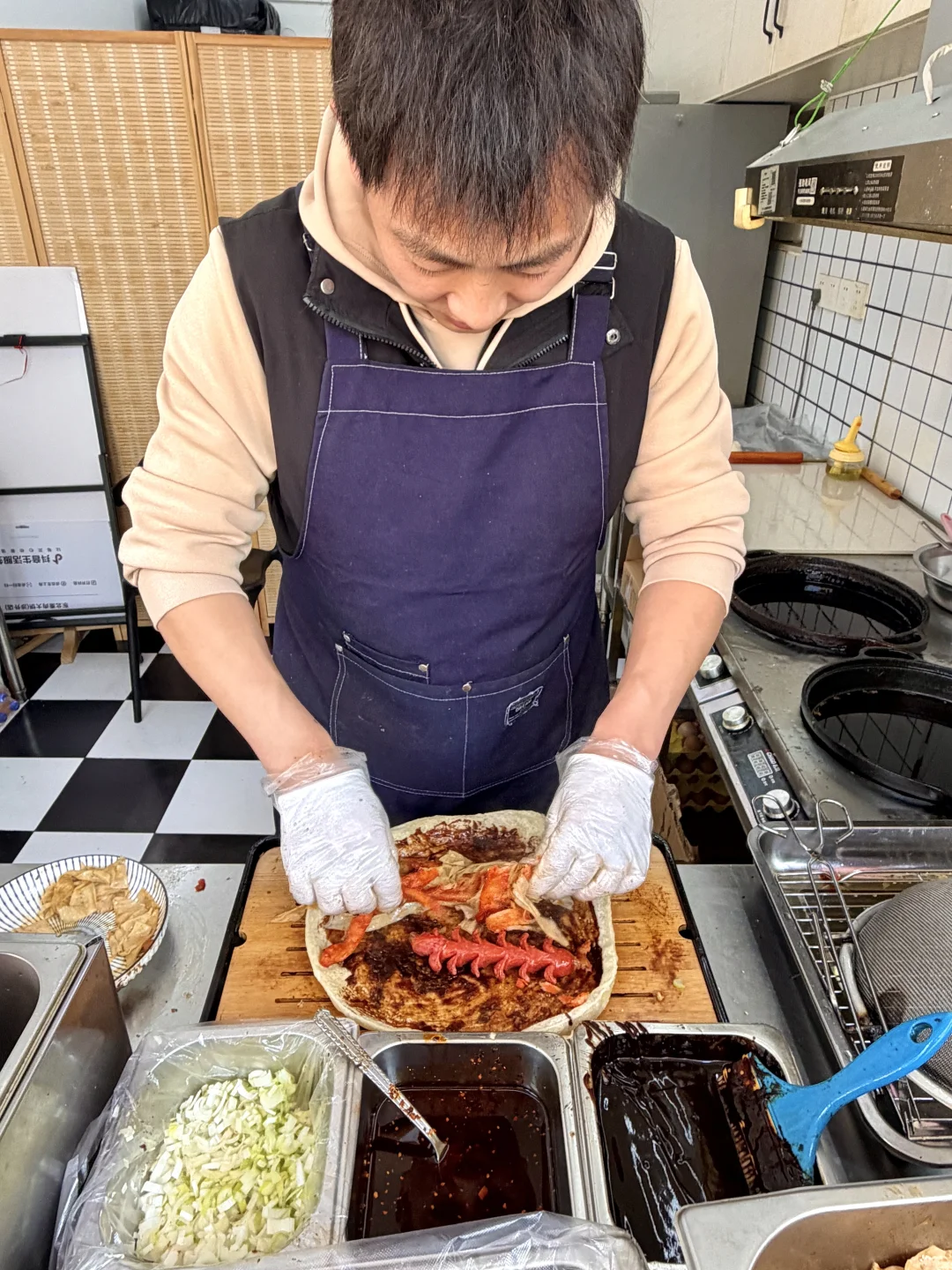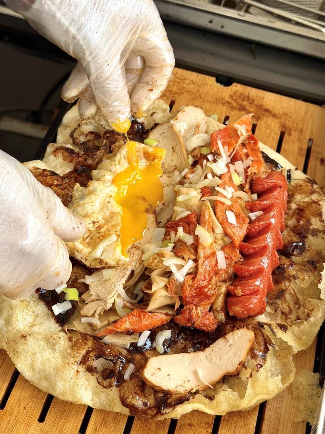 球球你们都去吃这个熏肉大饼🥹人均10r 里面加的熏肉、火腿、里脊肉……一定要加糖心蛋!!真的很好吃!!辣油巨香 跟着长沙大学生去吃的!爬完岳麓山直奔的 就在涉外西门:奚贵立 东北熏肉大饼