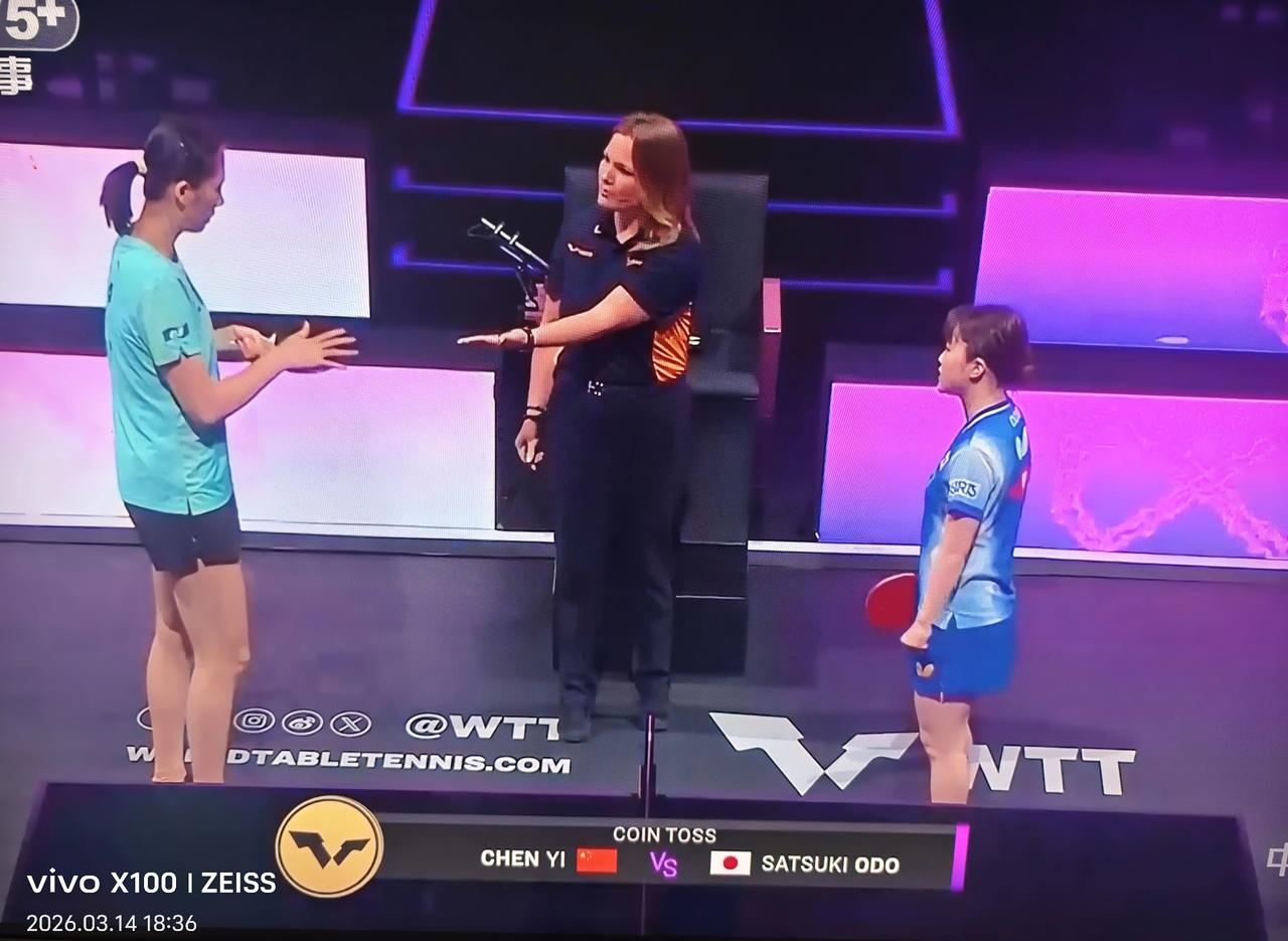身材高挑的陈熠🇨🇳[赞]! 身材很像伊藤美诚的大藤沙月🇯🇵! 两个人站在一起挑边,陈熠选了先发球,大藤选了球台方向。 这是2026WTT冠军赛重庆站女单1/4决赛。 21岁的陈熠目前世界排名第七位,也是21岁的大藤沙月世界排名第13位。 两人仅在2019年有过一次交手,陈熠4-0获胜,其年代久远参考意义已不大。 本站首轮比赛上大藤沙月爆冷淘汰王曼昱,心劲颇高。 陈熠与斯佐科斯的五局苦战已让她渐入佳境,相信陈熠能顺利晋级[奋斗]! 目前第一局陈熠4-2领先!