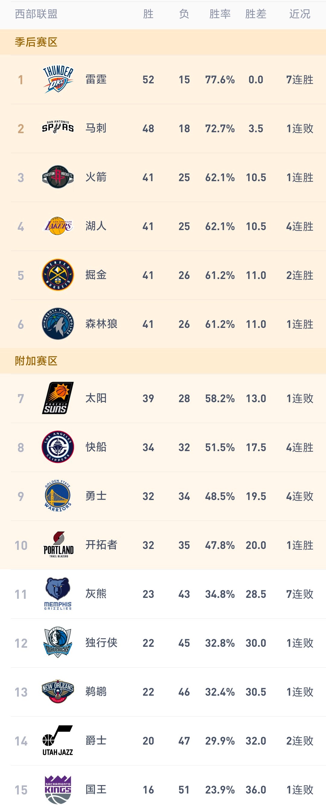 今日NBA排名观察东部一篇宁静 西部乱成一锅粥关键战况 火箭107-105绝杀鹈鹕,杜兰特32分6板5助,准绝杀森林狼127-117胜勇士,爱德华兹42分8板5助湖人昨天赢球后又被火箭反超勇士目前情况:32胜34负(四连败 西部第九)领先优势:只比第10的开拓者多0.5个胜场落后差距:被第8的快船拉开到2个胜场赛程前瞻:开拓者:76人、篮网、步行者、森林狼勇士队:尼克斯 奇才 凯尔特人 活塞 老鹰 独行侠一句话总结:雷马两队互掐 3-6名一场换一名次。勇士:第9不保,第8太远,第10追尾。金州勇士NBA
