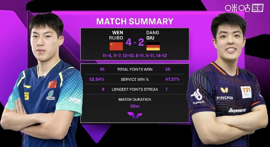孩子争气又争气,温瑞博世界排名锁定前20 比赛关键看点: ● 强势开局:温瑞博前两局迅速掌控节奏,分别以11-4和11-7拿下,展现出高质量的近台压迫打法。 ● 第三局逆转:在7-10落后、面临局点的情况下连得5分,以12-10险胜,大比分3-0领先。 ● 邱党反扑:经验丰富的邱党随后连扳两局(11-8、11-5),将比赛拖入第六局。 ● 惊险取胜:第六局双方缠斗至12平,温瑞博在9-10落后时挽救局点,最终以14-12锁定胜局。