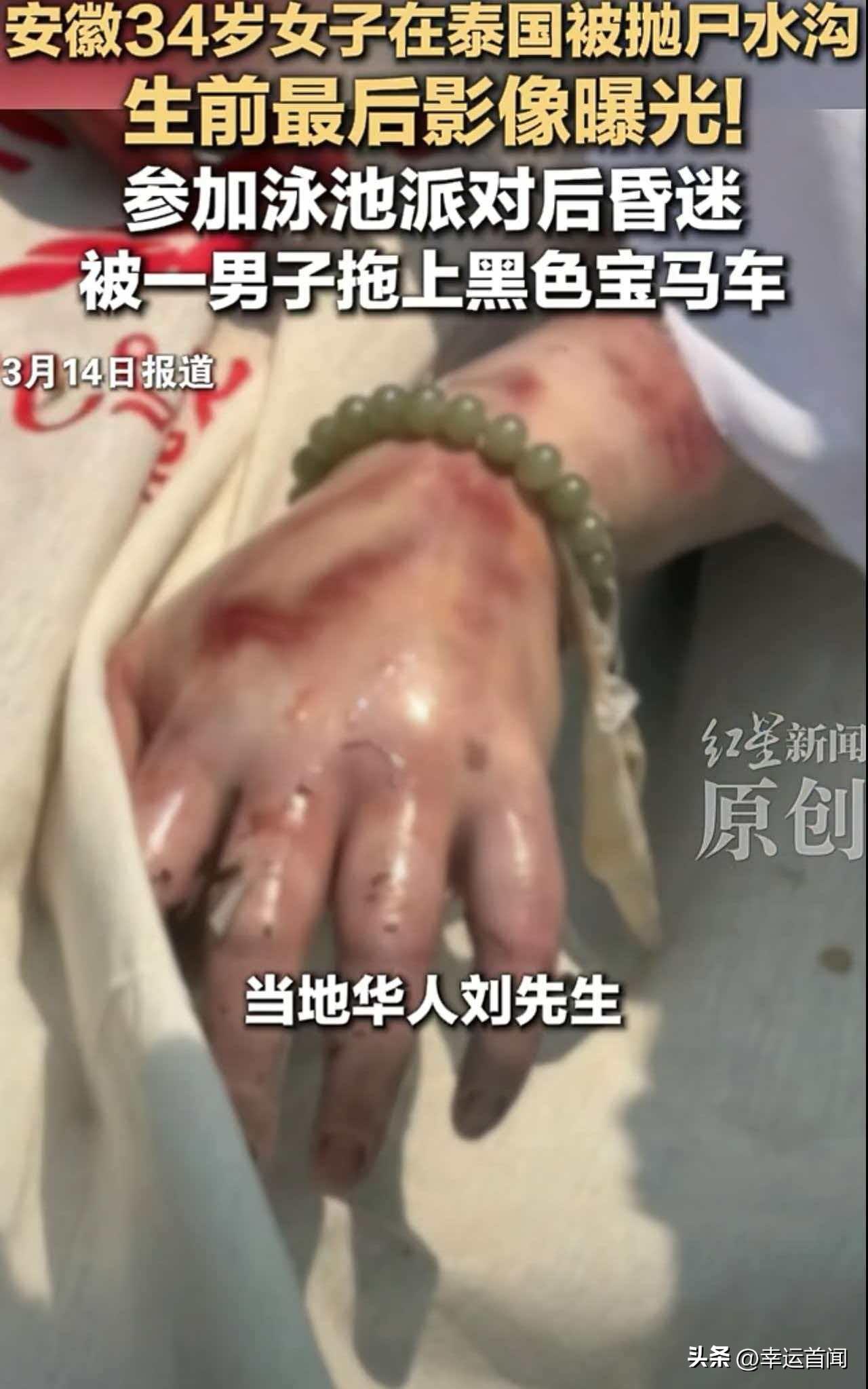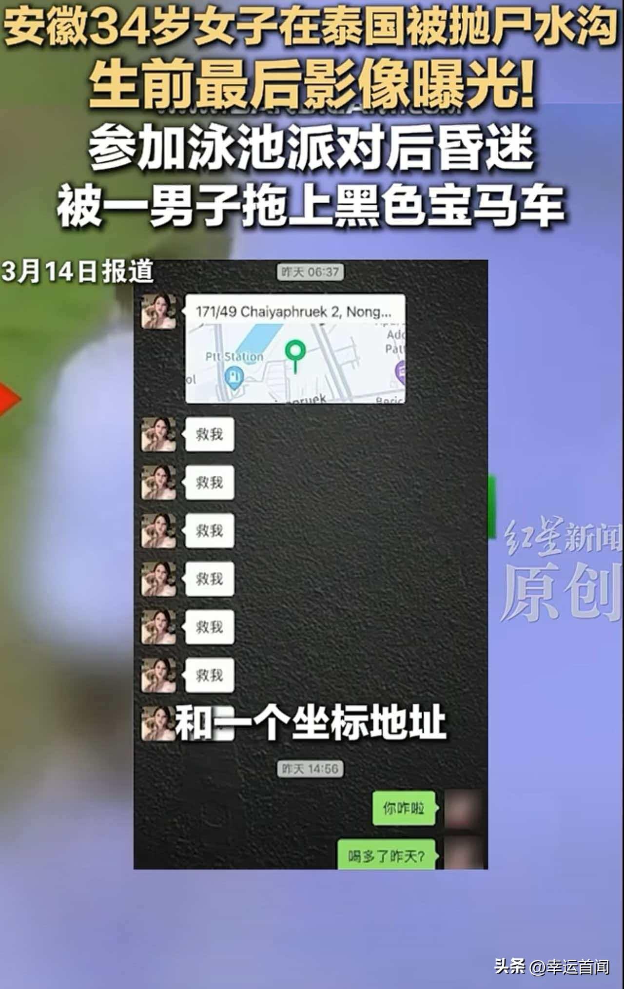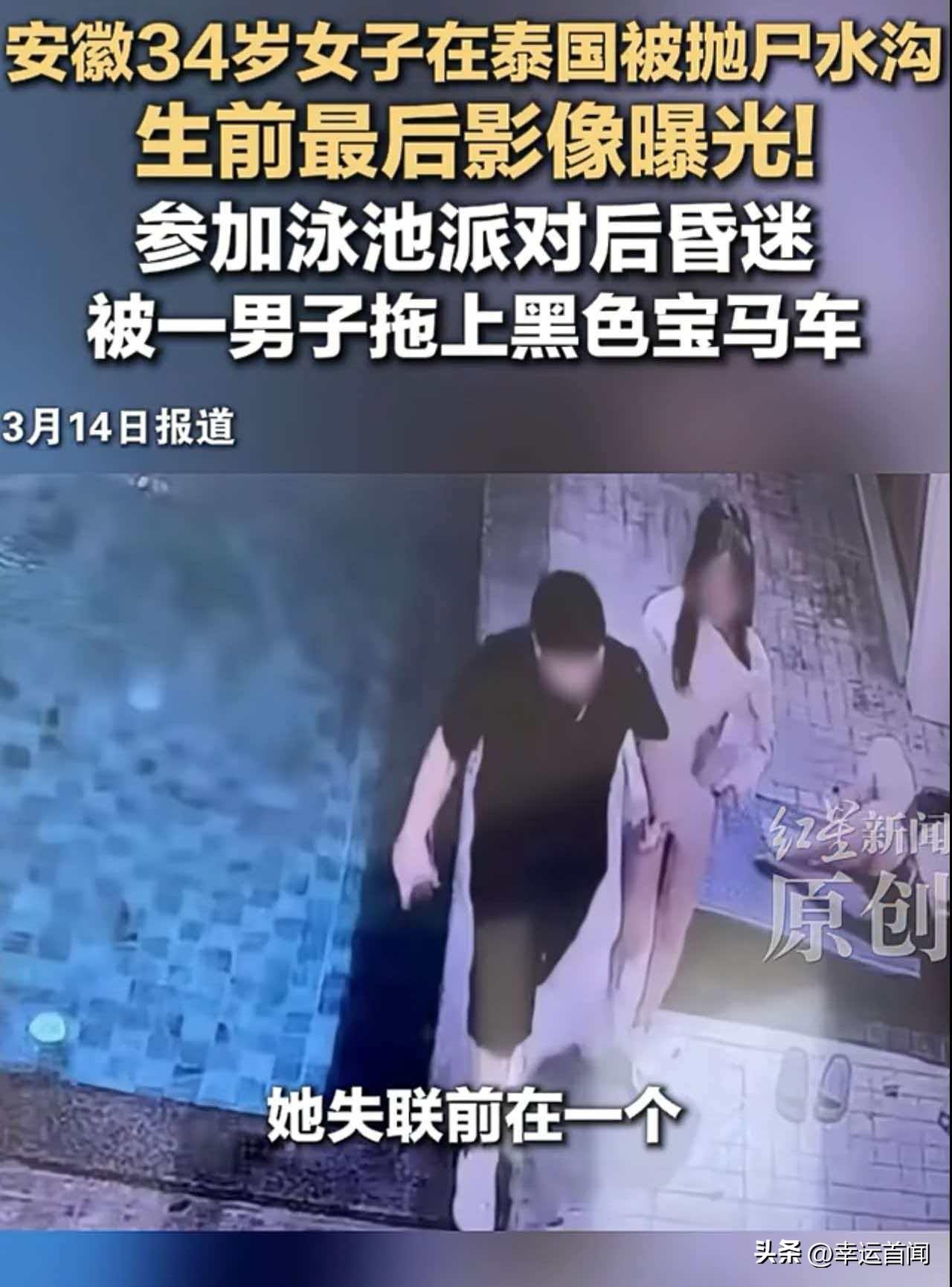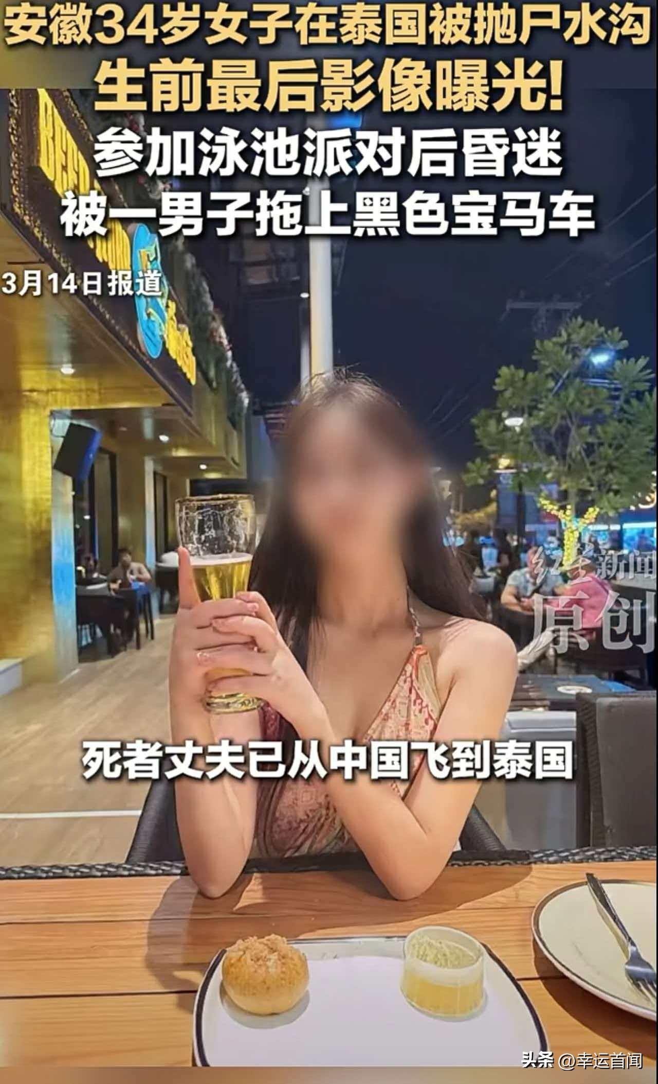 中国女子赴泰参加泳池派对后遇害 遗体被弃水沟 嫌疑人已锁定 据新京报、红星新闻等多方消息,一名34岁中国女子在泰国参加泳池派对后不幸遇害,遗体被抛至水沟,案件引发广泛关注。 据悉,事发于2月21日,该女子在失联前曾向朋友发送求救信息及定位坐标,随后失去联系。其朋友收到信息后立即报警。根据当地警方调取的监控影像显示,女子生前最后出现在一处别墅泳池派对现场,派对结束后,一名男子将处于昏迷状态的她带上一辆黑色宝马车,此后女子下落不明。 数日后,警方在距离事发泳池200多公里的一处水沟内,发现该女子遗体。据当地华人协助核实,死者为34岁安徽籍人士,其丈夫已从国内赶赴泰国,在华人协助下领取妻子遗物,并前往警局配合案件调查。 目前,泰国警方已锁定一名赵姓男子为本案嫌疑人,案件仍在进一步侦办中。 需