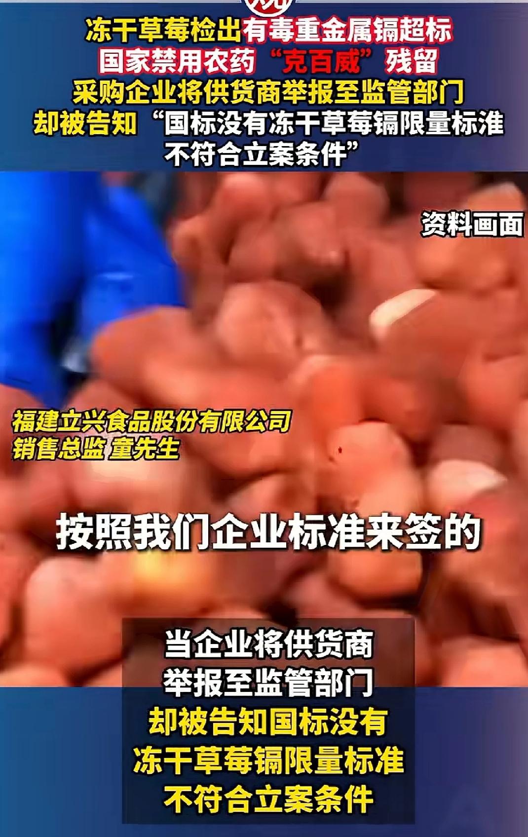 比冻干草莓更让人诧异的是,那句答复:“国标没有冻干草莓镉限量标准,不符合立案条件”。 明明有法律法规可以进行监管,但这句“不符合立案条件”的告知,却让人不忍直视。 食品安全关系到千家万户每一个人,这里有你有我,有每一名在这个大地上生活的活生生个体,必须要在源头上做到严把关、把好关。 问一句这些人,让每一个人能安心吃、放心吃不是更好吗?