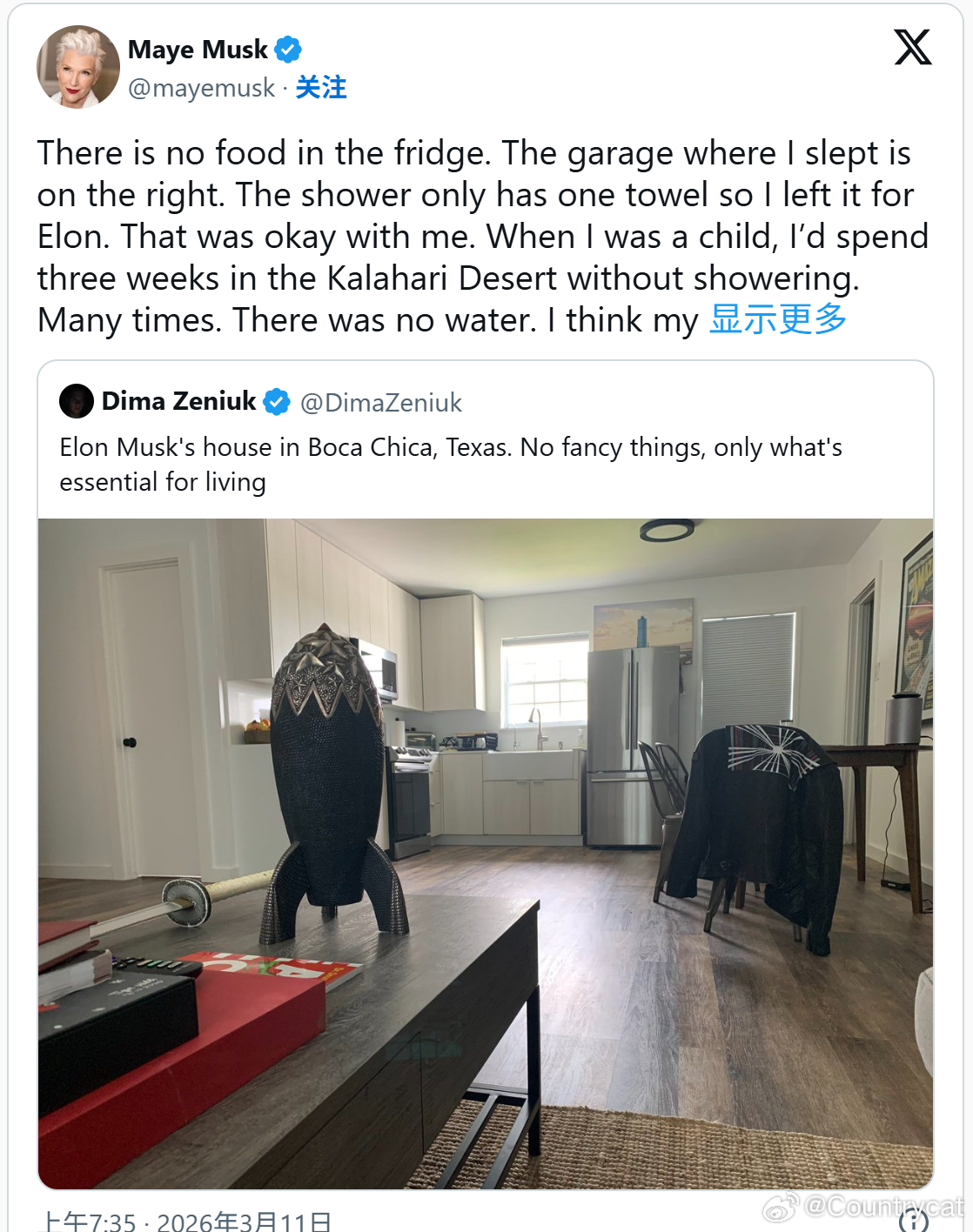 这条帖子随后被马斯克的母亲梅耶·马斯克转发,她还透露了一些不为人知的细节。梅耶开玩笑说,儿子的冰箱里几乎没有任何食物,而她去看望儿子时,“睡觉的地方就是照片右侧的‘车库’”。