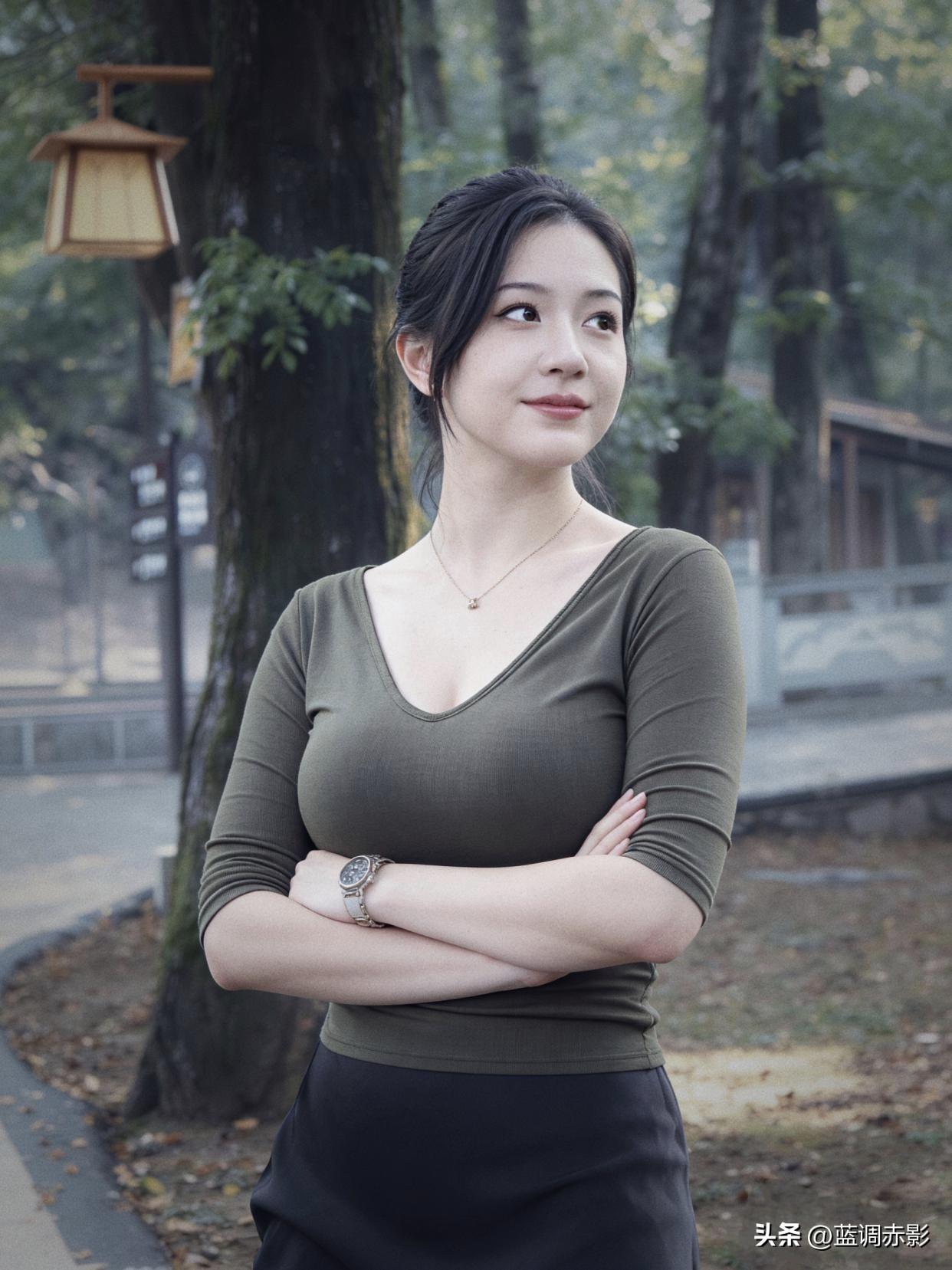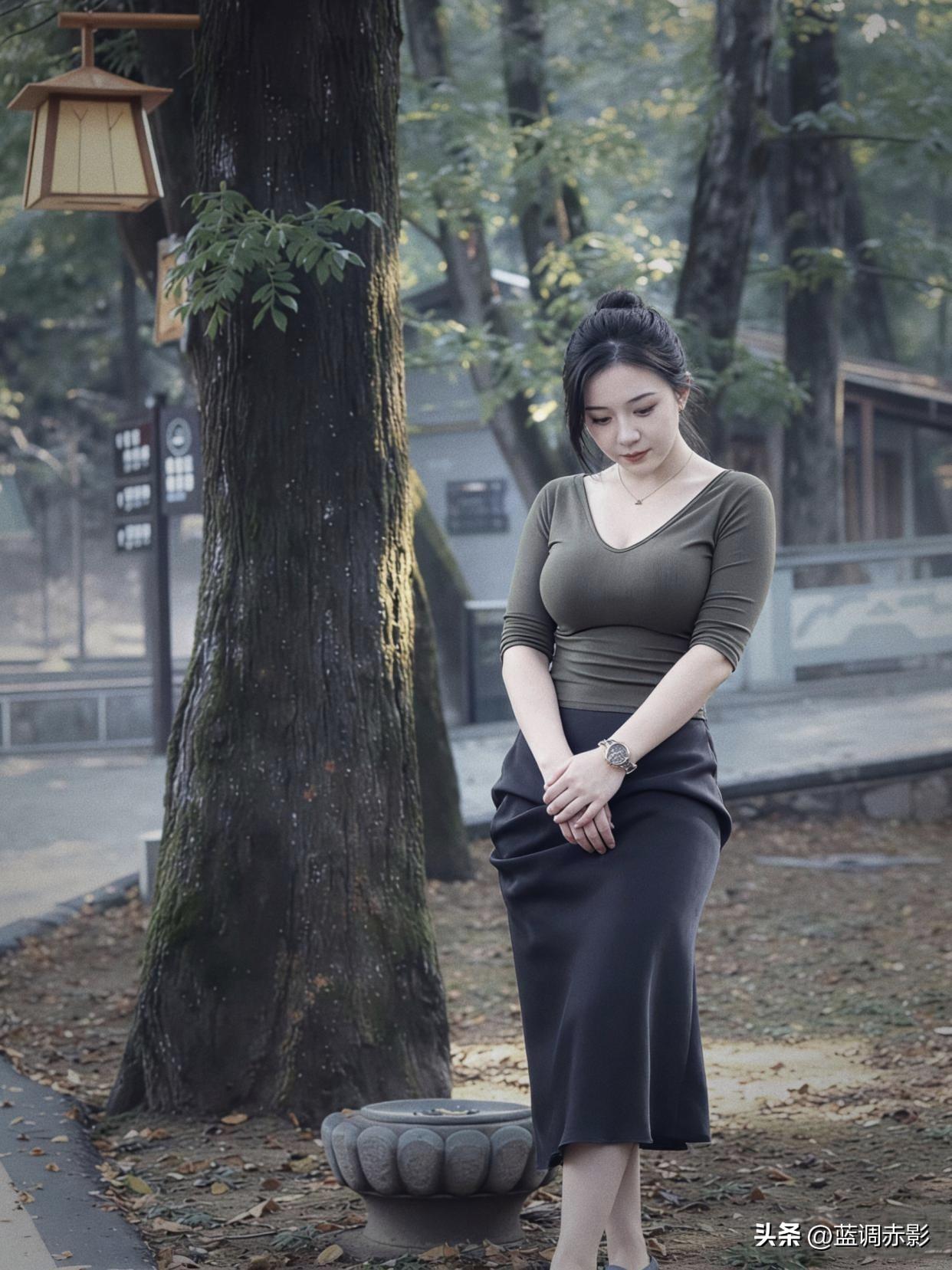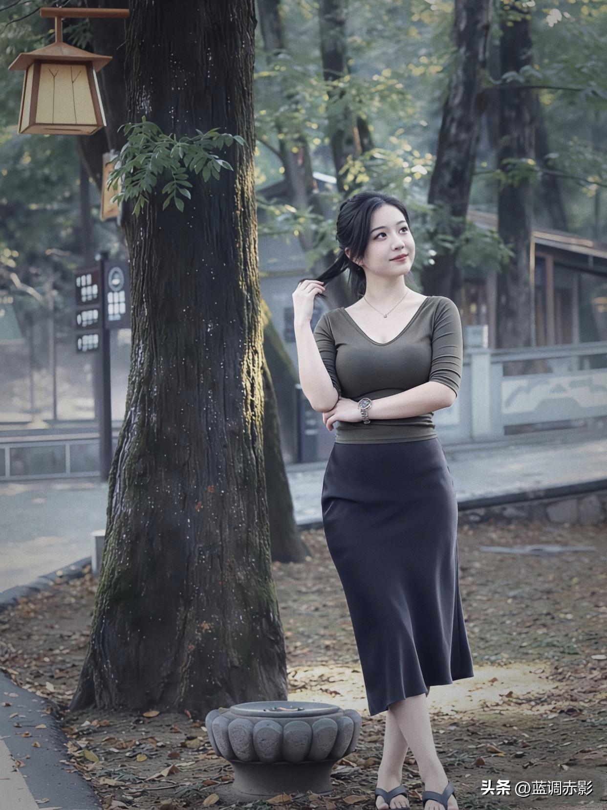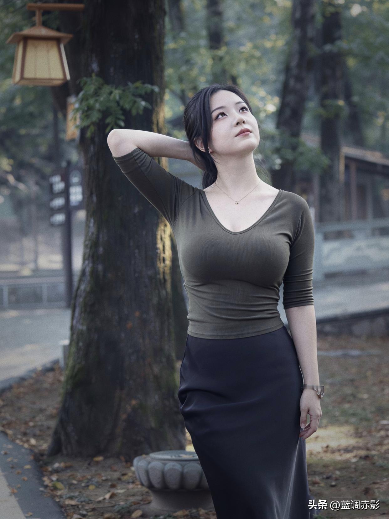 秋日暖阳下,优雅女子倚树而立,静谧如画。