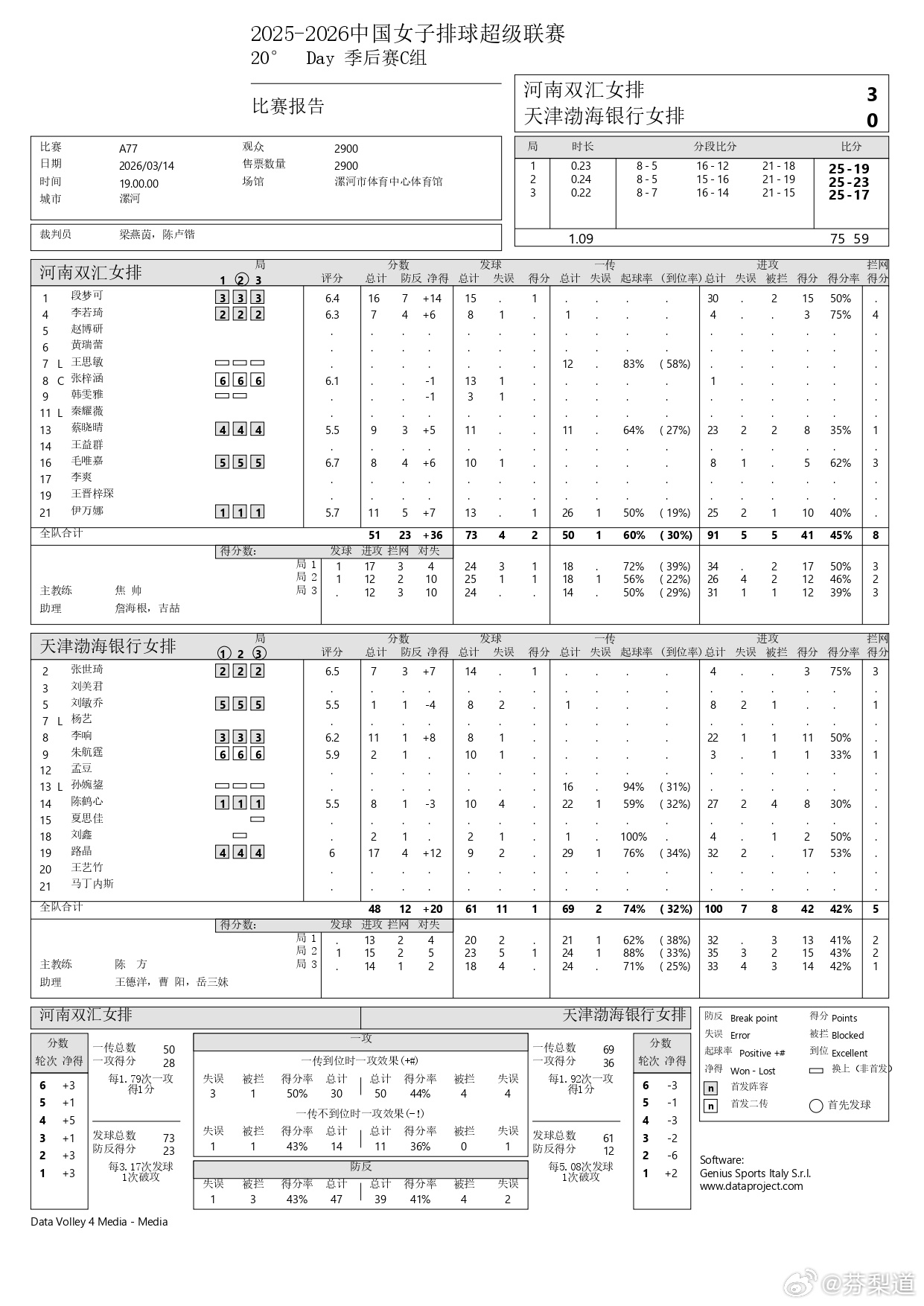 2025-2026赛季中国排球超级联赛天津渤海银行女排河南女排3-0天津女排的技术统计,路晶17分最多,歌星9分 23扣8中2失误2被拦 1拦