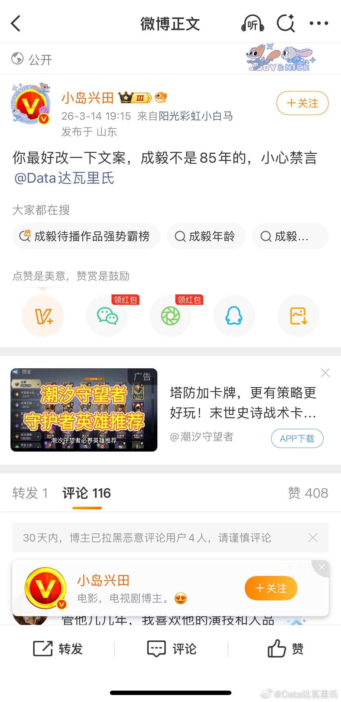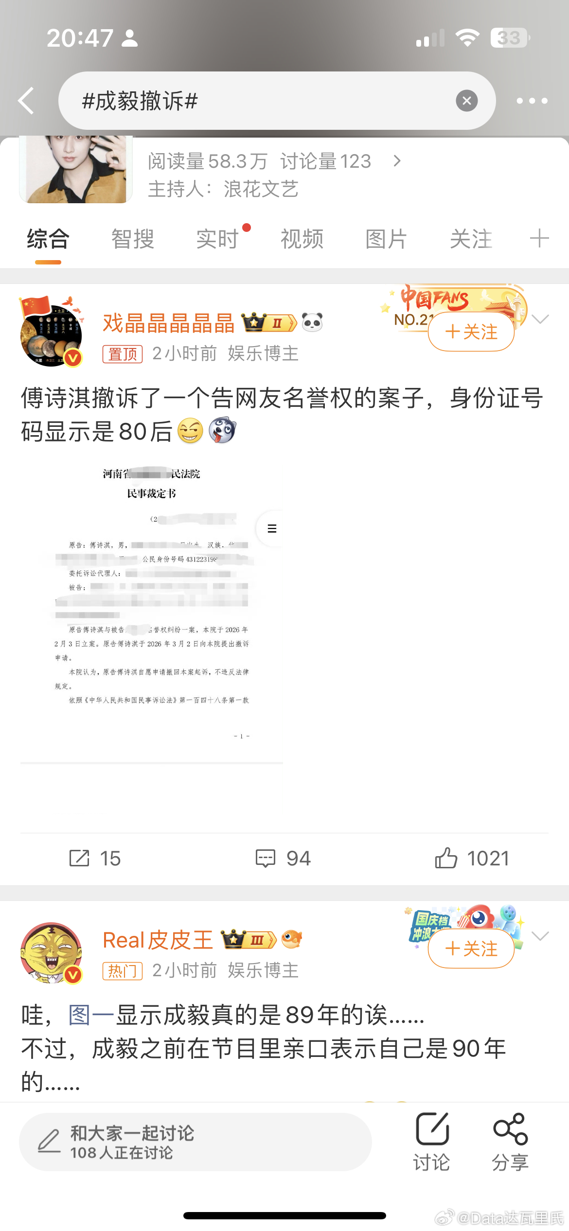 成毅撤诉我说成毅是85生,脂粉挂我并威胁说他不是85年的,我会被禁言