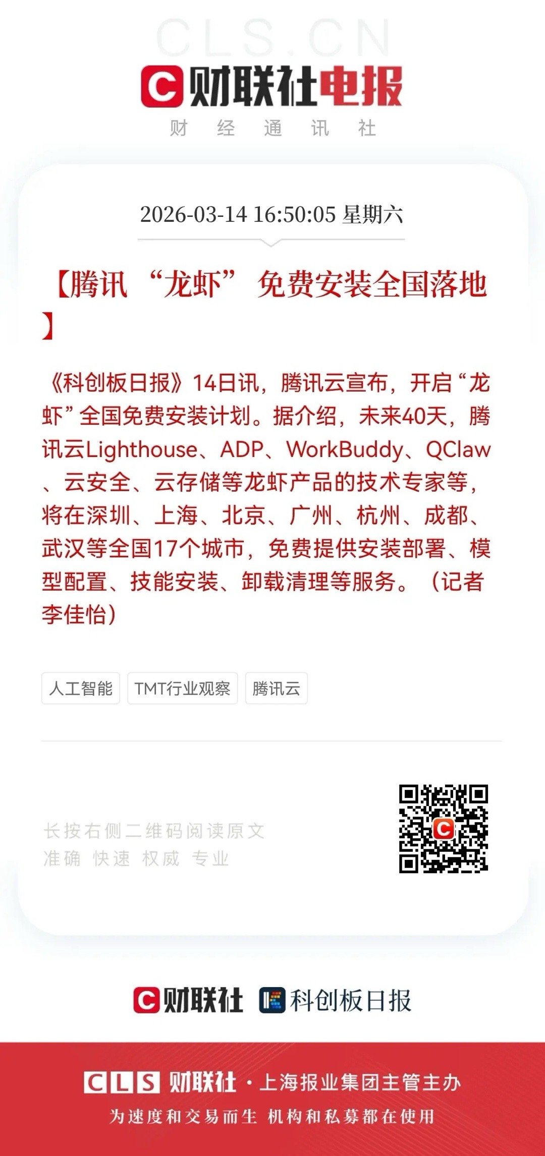 重大利好消息!腾讯云迎利好消息,腾讯云正式宣布启动“龙虾”全国免费安装计划,相关产业链将迎更多机遇3月14日,腾讯云正式宣布启动“龙虾”全国免费安装计划,这场覆盖北上广深等17座核心城市的线下行动,不仅是一次产品推广,更是云厂商争夺AI智能体入口的关键落子。此次活动覆盖深圳、上海、北京、广州、杭州、成都等17个城市,周期长达40天。腾讯云集结Lighthouse、ADP、WorkBuddy、QClaw及云安全、云存储等“龙虾”系列产品技术专家,提供从安装部署、模型配置、技能安装到卸载清理的全流程免费服务。值得注意的是,腾讯还将在深圳、上海、北京等地的核心地标限时返场“公司楼下免费安装”活动,无需预约即可现场完成部署,同时开启“高校龙虾专列”,面向师生开展AI科普与实训活动,进一步拓宽生态覆盖边界。从产品矩阵来看,“龙虾”体系并非单一工具,而是覆盖个人、企业、开发者的全场景解决方案:个人端QClaw支持微信/QQ直连,实现手机远程控电脑;企业端WorkBuddy集成企微、飞书,主打办公自动化;云端Lighthouse依托轻量服务器实现7×24小时稳定运行,适配开发者长期任务需求;企业级ADP则聚焦安全合规与定制化部署,满足不同层级用户需求。这场免费装机潮的背后,是云厂商对AI时代核心入口的角逐。OpenClaw作为AI智能体框架,能让AI直接操作系统完成任务,打破传统大模型“只说不做”的局限,其开源热度已登顶GitHub全球榜单。腾讯通过免费部署降低技术门槛,一方面引导用户转向云端部署,带动云服务器、模型调用等长期算力消费;另一方面积累真实场景数据,反哺模型优化,同时绑定QQ、企业微信等生态入口,构建起从工具使用到生态服务的完整闭环。当下,AI智能体赛道竞争已趋白热化,腾讯以线下快闪式装机打破线上推广的局限,用“免费安装+付费调用”的模式降低用户试错成本。这场全国性落地行动,不仅加速了AI生产力工具的普及,更将重塑云厂商与用户的连接方式,为AI商业化开辟新路径。