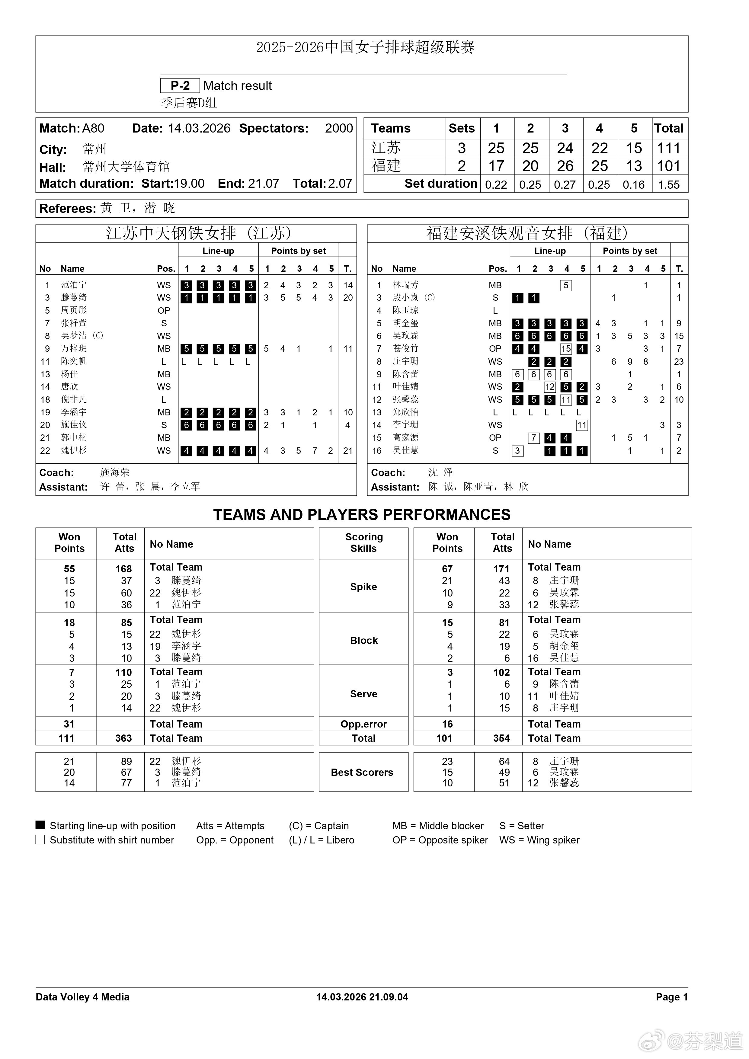 庄宇珊 女排A级季后赛第20轮比赛,江苏中天钢铁主场3-2福建安溪铁观音吴梦洁、张籽萱等主力轮休,魏伊衫21分本队最高,60扣15中4失误5被拦 5拦1发雨刷打了第2/3/4共三局,贡献23分全场最高,43扣21中5被拦2失误 1发1拦 2025-2026赛季中国排球超级联赛江苏中天钢铁女排