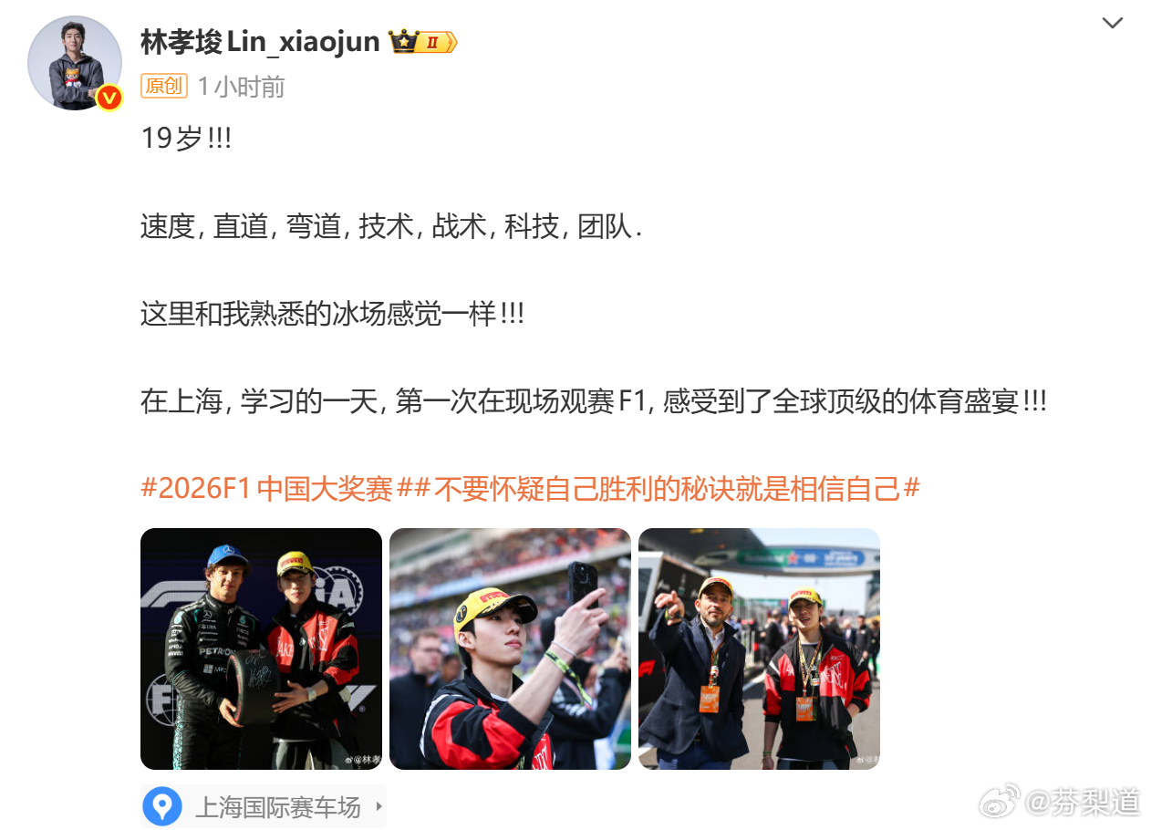 林孝埈称F1像熟悉的冰场F1中国大奖赛小林这是再次体验到速度的快感了……19岁!!!