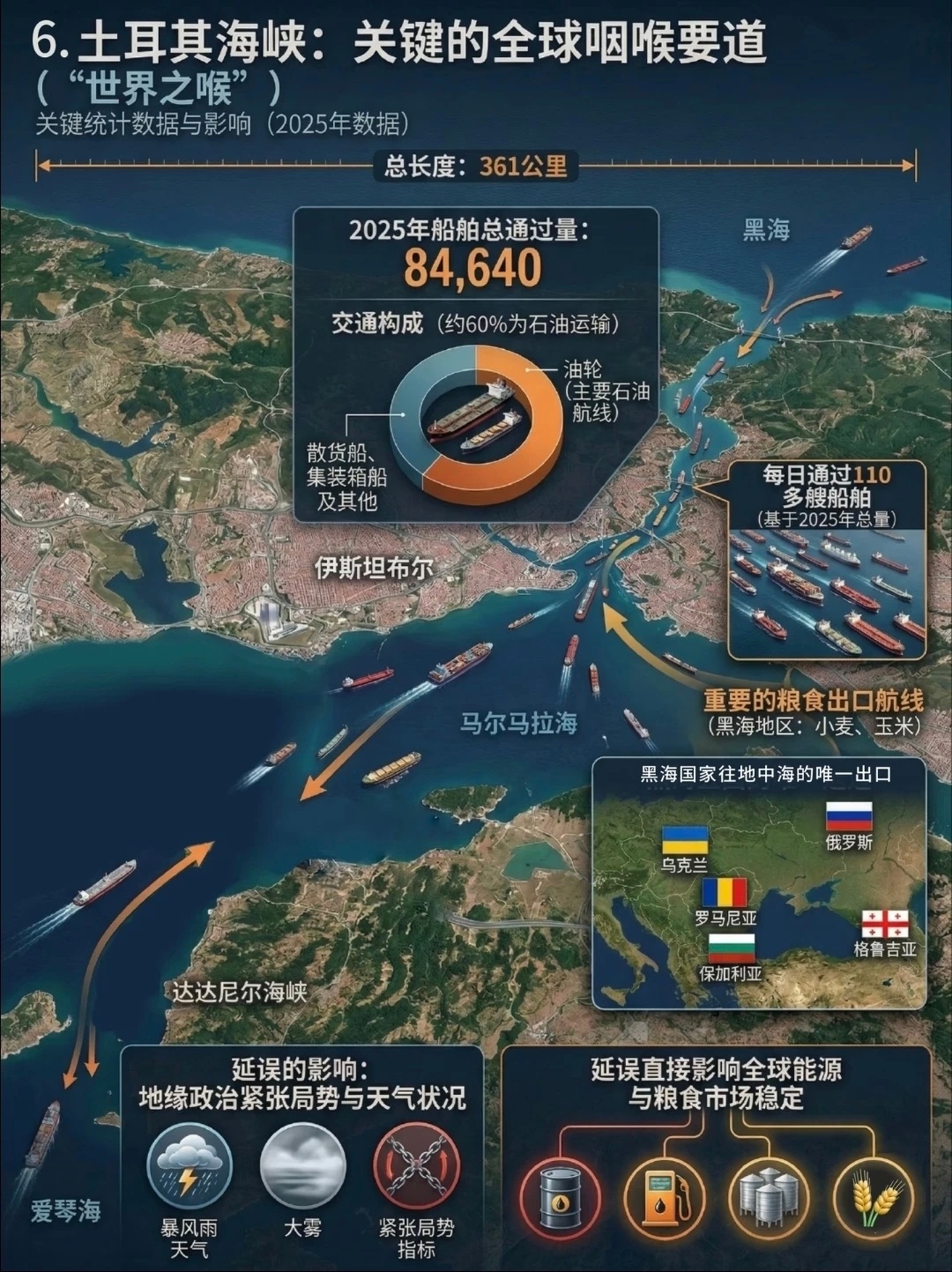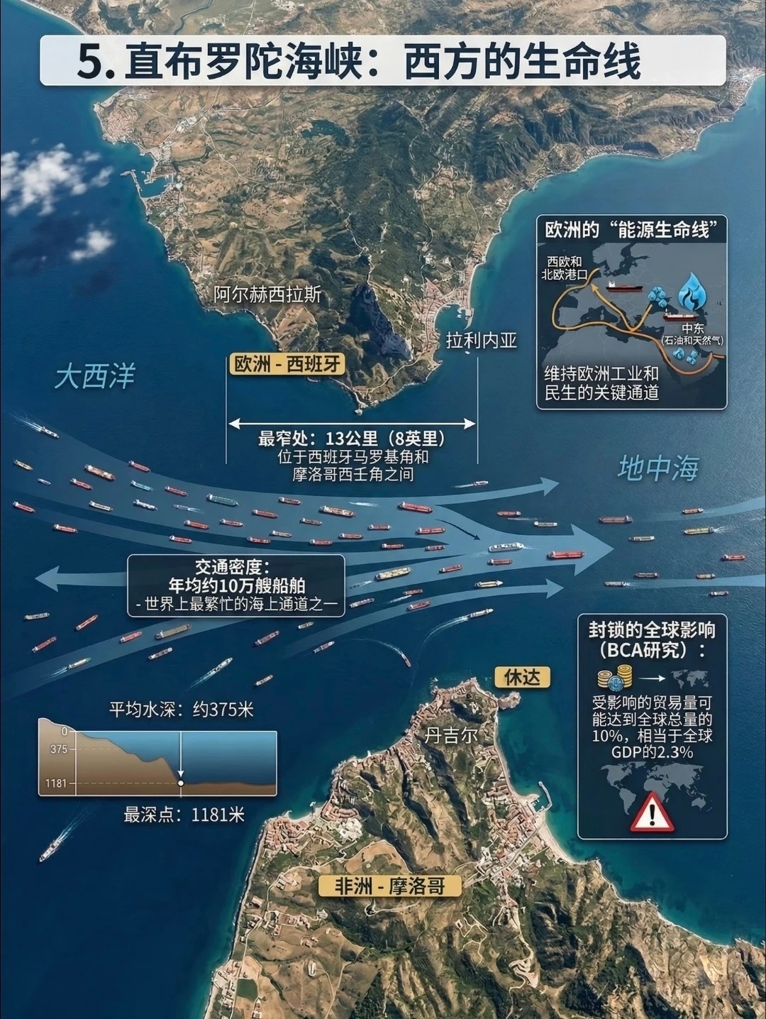 霍尔木兹、马六甲、曼德三大海峡控制全球石油运输命脉;英吉利、直布罗陀、土耳其海峡支撑欧亚非贸易往来。近期,因美以军事打击,霍尔木兹海峡已事实性陷入封锁状态,该海峡最窄处仅33公里,每天约2000万桶石油通过,是波斯湾石油通往世界的唯一海道,全球约20%液化天然气贸易经此。