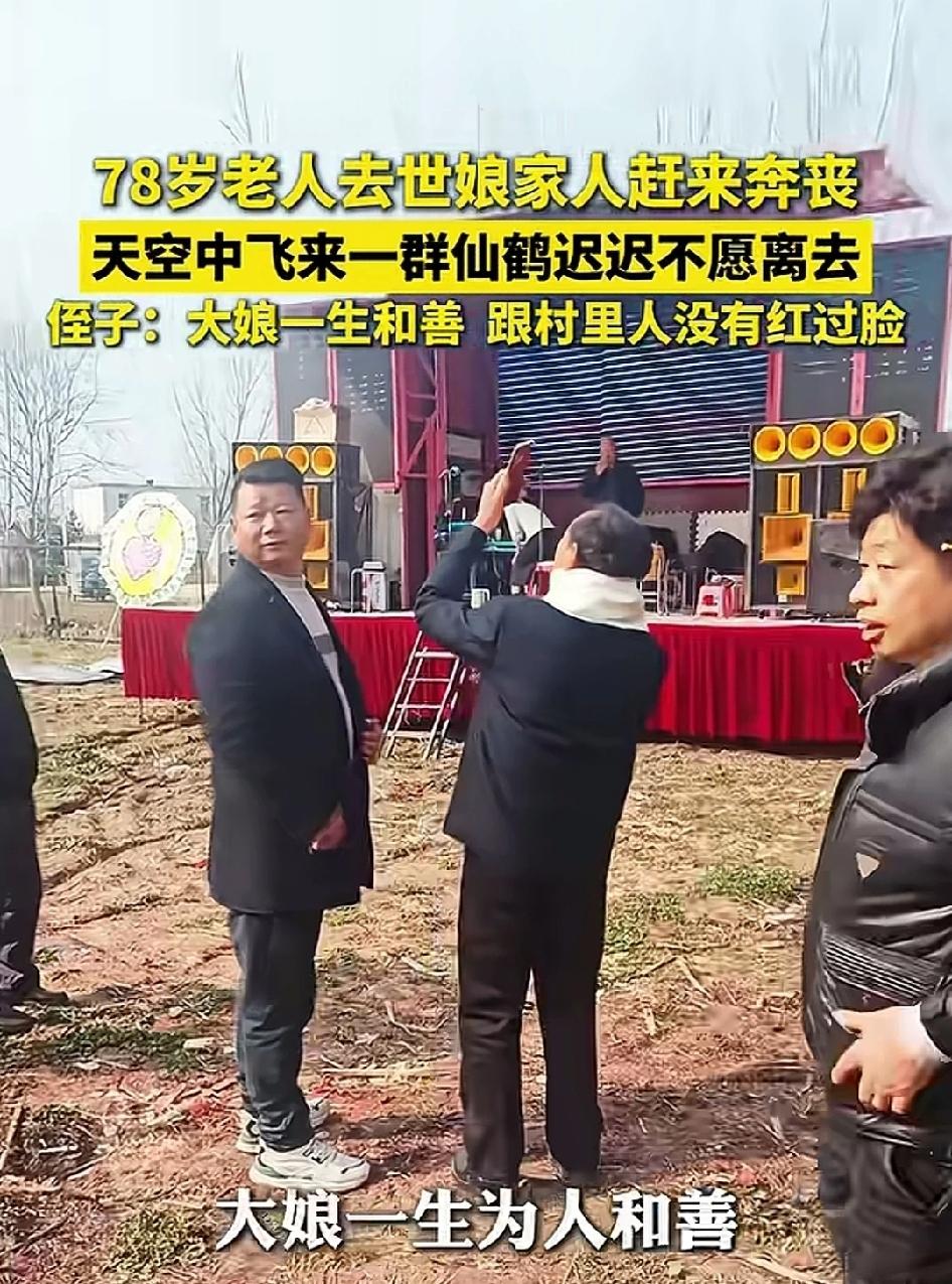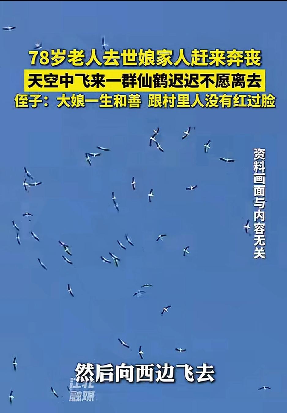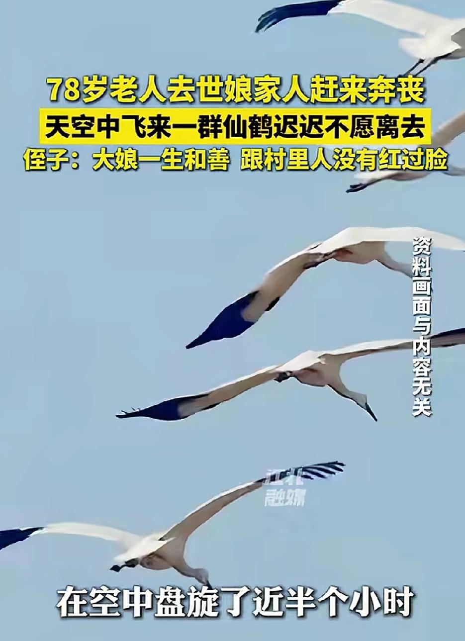 科学都解释不清了!78岁老人离世,娘家人赶来奔丧,没想到天空中突然飞来一群仙鹤,久久盘旋不愿离去。侄子含泪说:大娘一生和善,从没跟村里人红过脸,这是来送她最后一程的。 2026年3月12日,安徽淮南一个再普通不过的小村庄里。 78岁的王大娘,安安稳稳、没遭一点罪地走了。 消息一传开,远在外地的娘家人,心一下子揪紧,连夜开车往回赶,一路上心里又慌又酸,就怕赶不上送老人最后一程。 家里按村里老规矩,搭起了灵棚。 白幡挂得整整齐齐,被风一吹,轻轻晃悠。 低沉的哀乐一遍遍地放,声音不大,却钻到心里去,听得人鼻子发酸、眼眶发热。 来吊唁的乡亲,一个个低着头,说话都压着嗓子,不敢大声,生怕扰了老人。 儿女们守在灵前,腰都快弯断了,眼泪在眼眶里打转,强忍着不敢放声哭,心里一遍遍地回想: 娘这辈子,太苦了,太好了,太舍不得了…… 祭拜仪式刚一开始,所有人垂首肃立,现场静得只剩下哀乐和偶尔压抑的抽泣声。 就在这时候—— 天上突然传来一阵清亮亮、脆生生的鸣叫声。 不是麻雀那种叽叽喳喳,也不是乌鸦那种哑哑的, 是那种又干净、又悠远、又好听的声音, 一声接一声,一大片,直接穿透了哀乐,扎进每个人耳朵里。 所有人先是一愣,下意识齐刷刷抬头。 这一抬头,当场所有人都看呆了,连哭都忘了。 只见远处天边,一大群通体雪白的大鸟,被村里人都叫“仙鹤”, 数不清到底有多少,几十只?上百只? 一片白,从远处慢悠悠、稳稳当当飞过来, 翅膀伸得长长的,一上一下,姿态优雅得不像话, 不偏不斜,正好一圈一圈,盘旋在灵棚正正上方。 它们飞得极有章法,一点不乱。 一会儿飞得很低,翅膀几乎要擦到灵棚的白布、白幡, 白羽毛在光线下看得清清楚楚,干净、柔和、庄重。 一会儿又轻轻往上一扬,重新飞回天上,在蓝天下划出一圈圈温柔的弧线。 清脆的鹤鸣,一声跟着一声,绵长又安详, 和地面上的哀乐缠在一起, 原本满是悲痛、压抑的现场, 突然就多了一股说不出来的震撼、肃穆,还有一股暖到心里的温柔。 在场的人,全都仰着脖子,看傻了。 本来哭得浑身发软的家人,仰着头望着天上这群鸟, 眼泪还挂在脸上,嘴角却忍不住轻轻抽动, 心里那股撕心裂肺的疼,莫名被抚平了一大半! 大娘的侄子仇先生,这几天一直操持后事, 可这一刻,他望着天上盘旋不停的白鸟, 鼻子猛地一酸,眼泪“唰”一下就下来了,心里又热又堵,又敬又暖。 他比谁都清楚,大娘这一辈子: 为人老实、心善、嘴软、脾气好, 一辈子在村里,从来没跟任何人红过一次脸、吵过一次架、说过一句重话。 谁家有难处,她主动上门搭把手; 谁家有急事,她能帮就帮,从不计较。 是十里八乡,人人都竖大拇指的老好人。 那一刻,仇先生心里只有一个念头: 好人,真的有好报。 人这一辈子积的德,连天上的灵禽都来送一程。 百十来只“仙鹤”,就这么安安静静、一圈又一圈, 在灵棚上空盘旋了将近30分钟。 不吵、不闹、不慌、不乱,像是在陪着仪式,陪着老人。 一直等到葬礼祭拜环节快结束, 这群白鸟才像是接到了信号一样, 齐刷刷调转方向,整整齐齐排成一片, 朝着西边的天空,慢慢飞去。 翅膀轻轻扇动,鸣声一点点变远, 越飞越高,越飞越远,最后彻底消失在天际,像从没来过一样。 直到鸟群彻底看不见了,现场的乡亲们,还仰着头,半天回不过神。 消息来源:网络公开内容,本文配图/视频素材来自网络,仅用于纪实分享与社会观察,如有侵权请联系删除,谢谢!