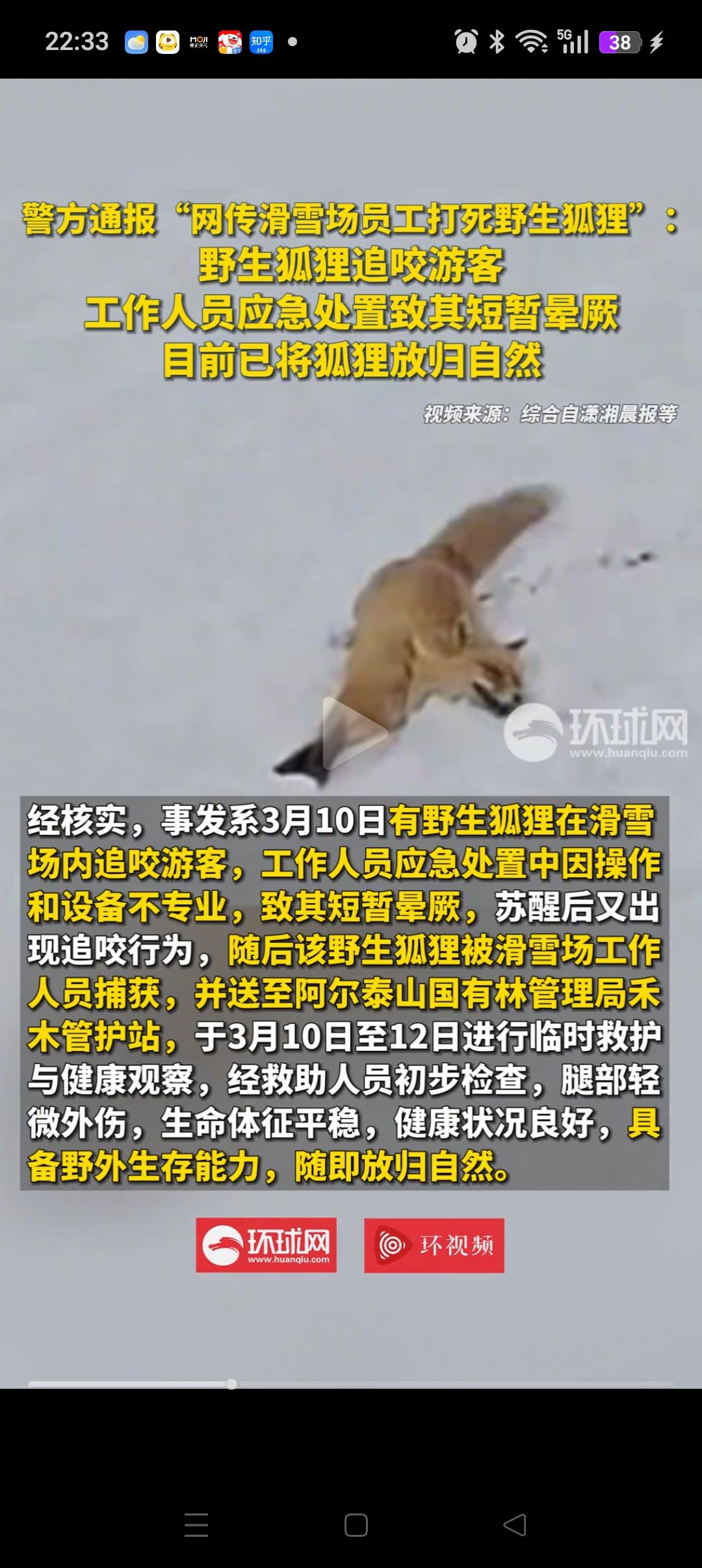 滑雪场员工打野生狐狸一事, 我发现一个重要细节! 那就是这只狐狸咬的只是游客的滑雪板,和鞋子,而不是手和腿等关键位置。说明它大概率以前被撞到过,才会这么应急。 其实不管这只狐狸是不是赤狐,属于二级保护动物。就算它只是一只普通的动物,工作人员也不能用杆子去打它,适当的驱赶即可。 如果不能有效的阻止狐狸进入滑雪场地,应该暂时停止运营,把场地封好在重新开始。 所幸这只狐狸并无大碍,被咬到的游客也没有受伤。孰对孰错,确实一时间很难说清楚,大家都是怎么看的[what][what]