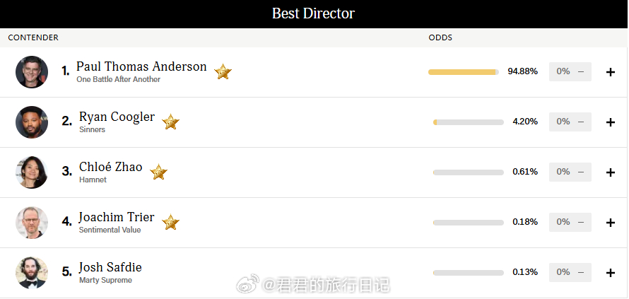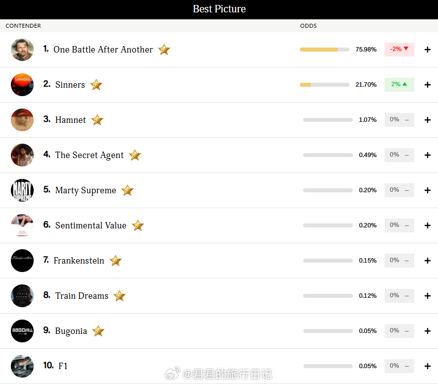 奥斯卡明天颁奖,来看看权威预测网站金德比目前的数据:最佳影片:《一战再战》胜率75.98%,《罪人》21.7%;最佳男主角:MBJ《罪人》61.52%,甜茶《至尊马蒂》26.16%;最佳女主角:杰西巴克利《哈姆奈特》97.44%;