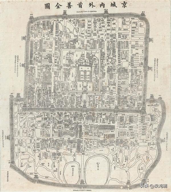这幅地图是绘制于清朝末年的《京城内外首善全图》。它是研究晚清北京城市布局的重要历史文献。 地图基本信息 名称: 京城内外首善全图 作者: 由上海人谈梅庆绘制 年代: 约绘制于 19 世纪中叶至末年(常见版本包括 1867 年、1902 年等)。 “首善”含义: 在中国古代,“首善”一词专门用来指代京城。 地图主要特征 城市布局: 地图详细描绘了北京的“凸”字形轮廓,中心位置是紫禁城(故宫)和皇城。 内外城区分: 内城(北侧): 布局规整,包含皇宫、政府机构及王公府第。 外城(南侧): 地图中外城的比例被特意放大。这是因为外城是当时普通百姓聚集的区域,胡同和街道非常密集复杂。为了能清晰标注所有的街道名称,绘图者增大了外城的显示占比。 详细内容: 该图详细标注了各个街道和胡同的名称,具有极高的行政管理和生活参考价值。 后世影响: 这幅地图后来被多次翻印,包括 1900 年义和团运动后日本人的翻印版本。