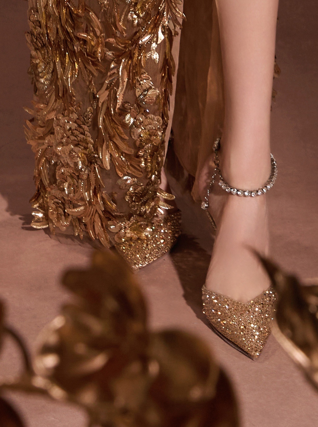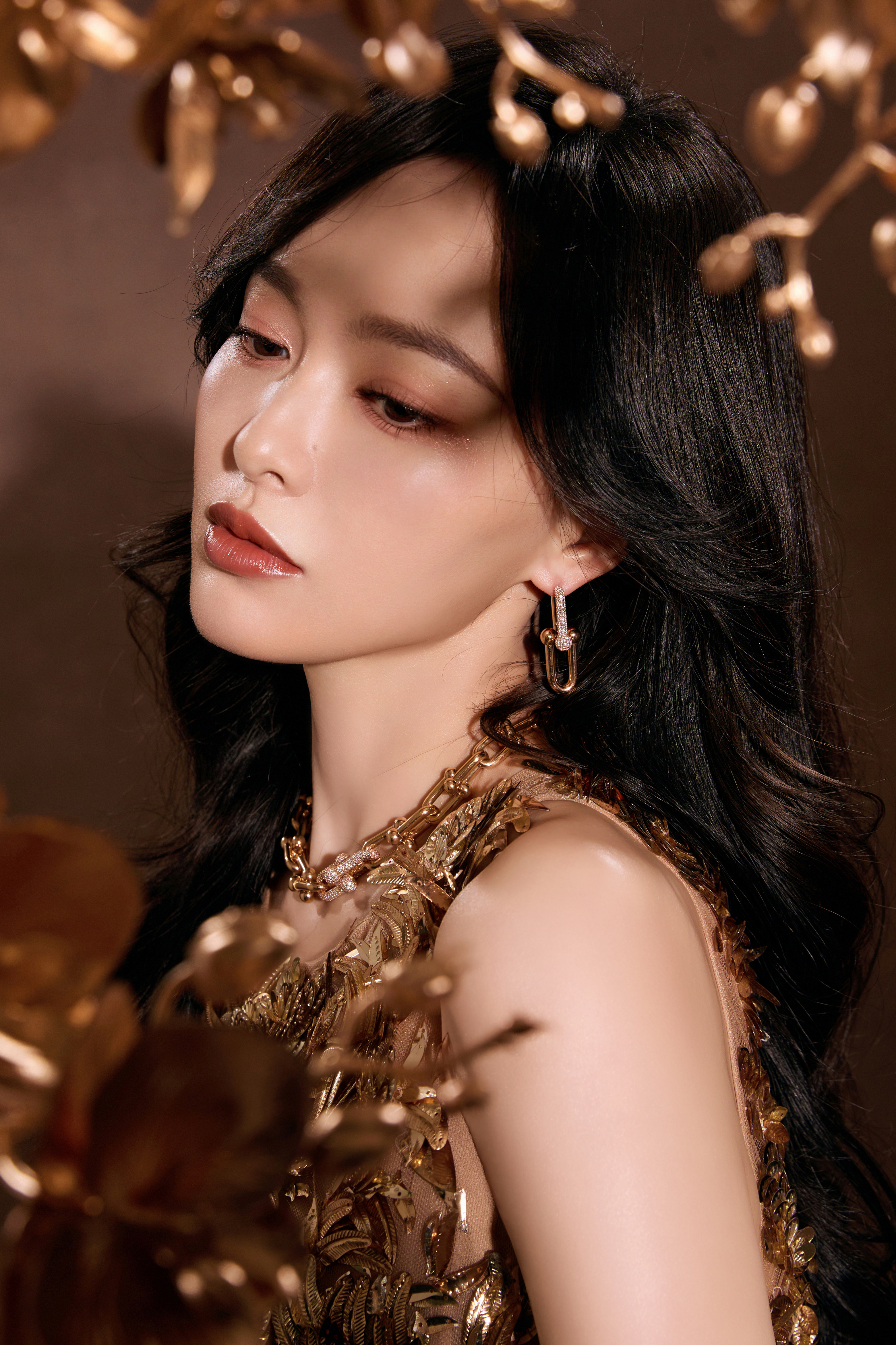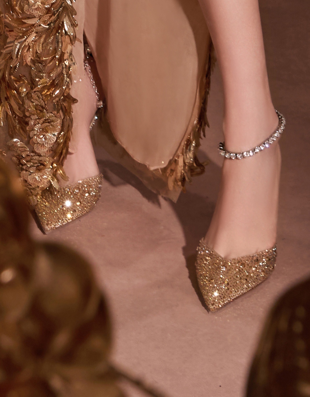 唐嫣张若昀主持糖糖金色镂空高开叉长裙 大长腿金色尖头半包细高跟