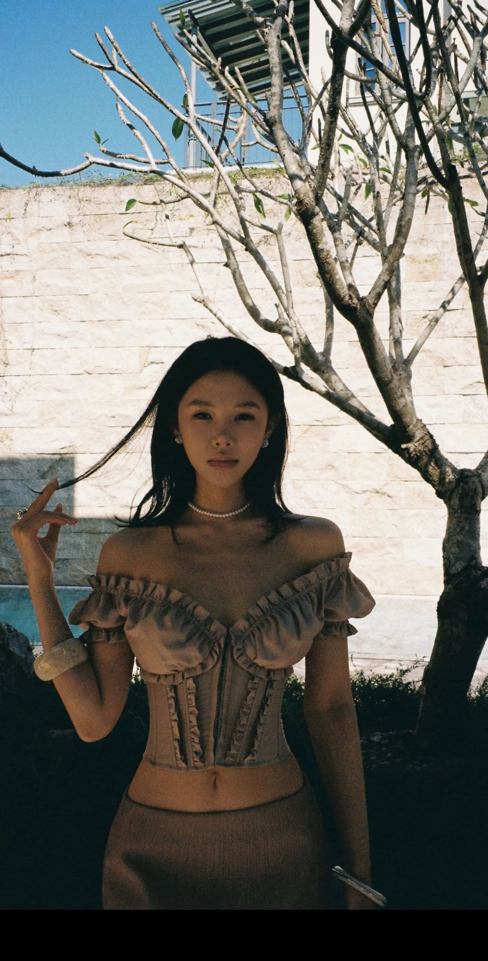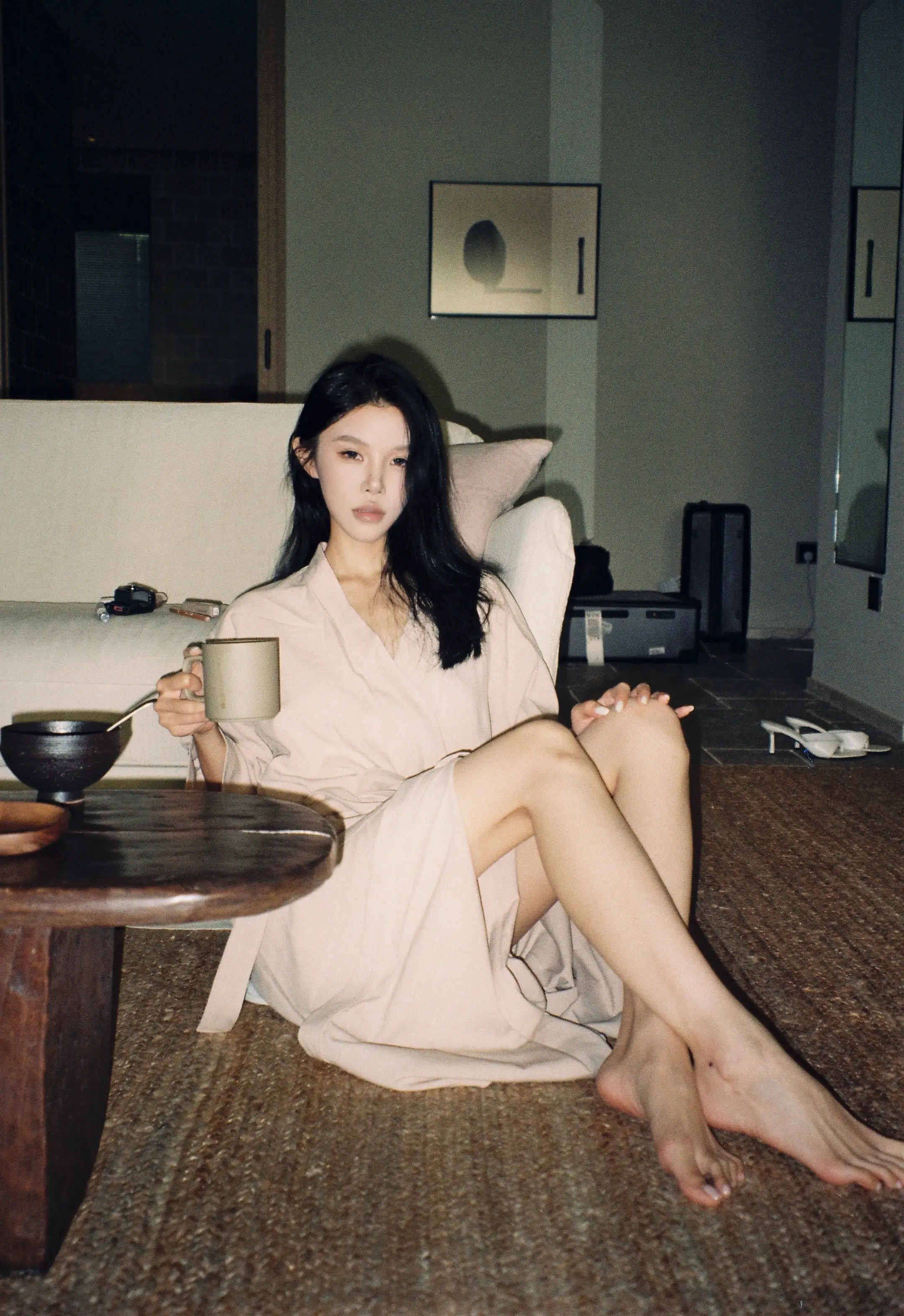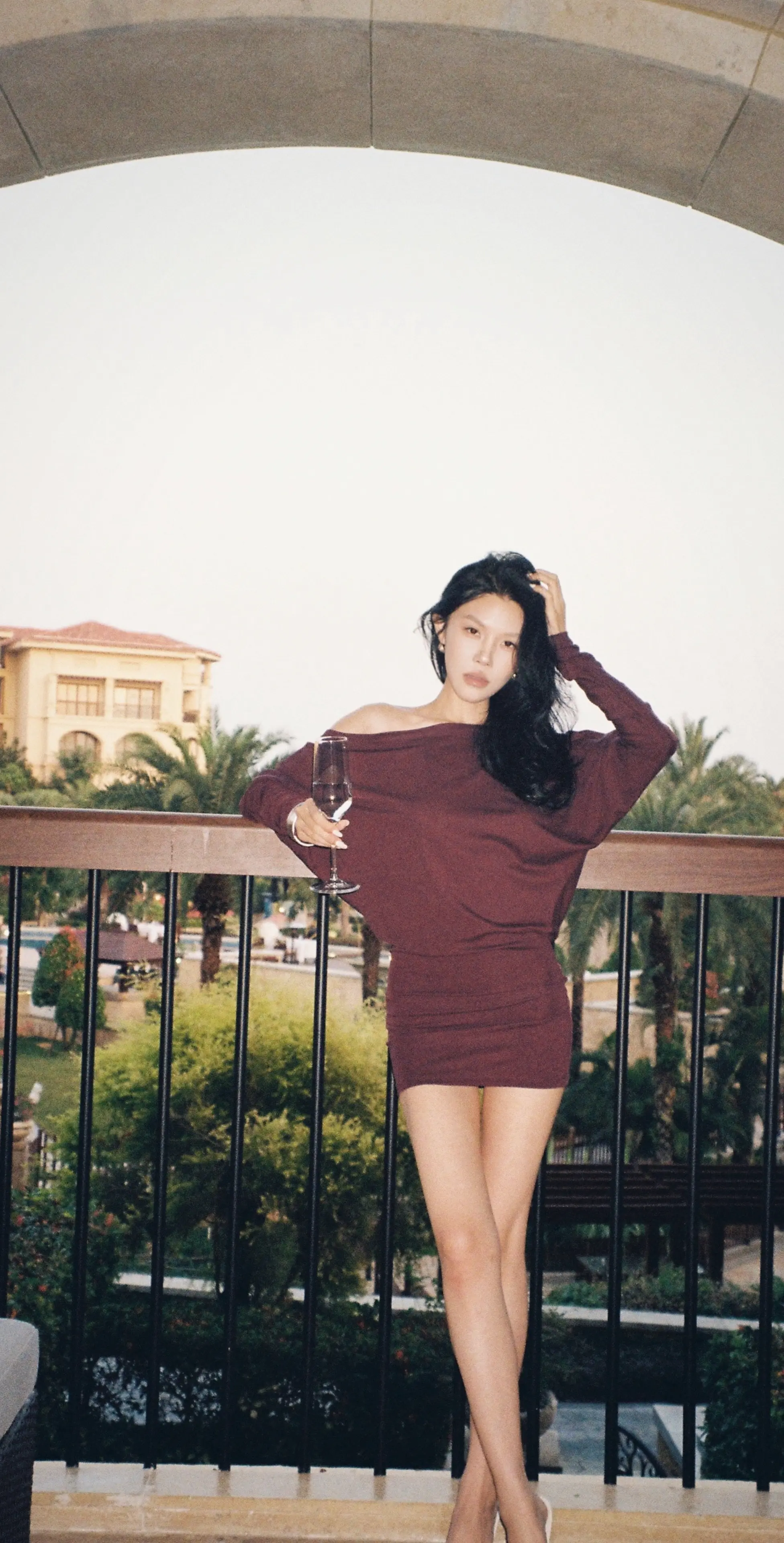 竖条纹旗袍的开叉恰到好处,衬得腿型修长,线条舒展而柔和;肤色均匀且细腻,姿态优雅